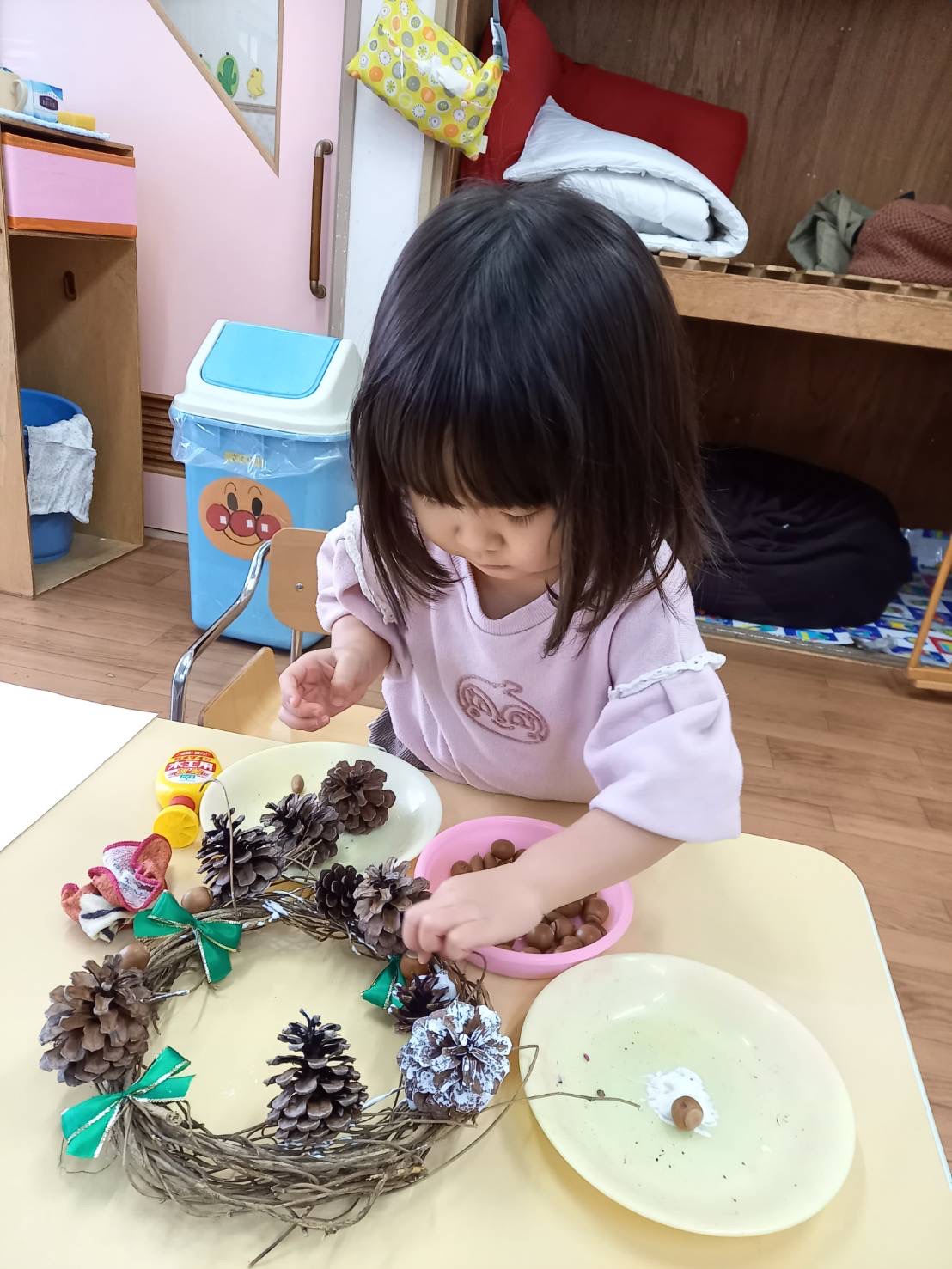 クリスマス前には遊んだ松ぼっくりやドングリをリースにしてお母さんにプレゼントする。