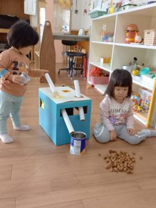 部屋の前にあるドングリの木から毎日落ちるドングリを楽しみし、カップを持って拾うことを楽しんだ。空容器に入れマラカスにしたり筒を繋げてドングリ転がしをして遊ぶ。砂場ではままごとに取り入れて見たて遊びをする。