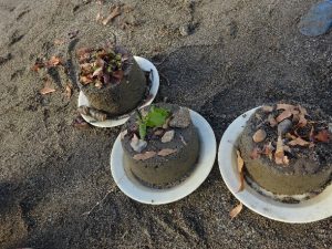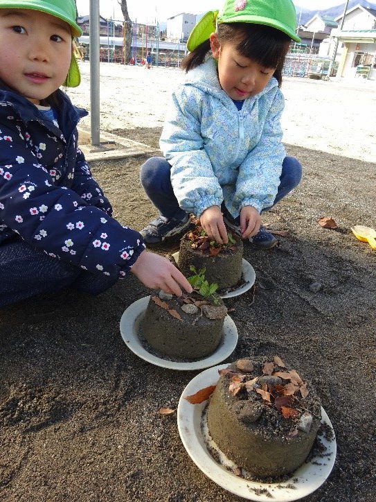 園庭や近くの森で拾ったドングリや松ぼっくりなどを使って見立て遊びをする