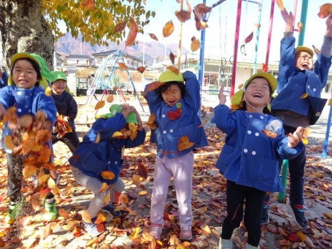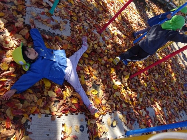 身近な秋の自然に触れ、遊びの中に積極的に取り入れて楽しむ姿がとても印象的であった。また、友だちと協力し合って落ち葉を集めたり「これ、楽しいよ」「一緒にやってみようよ」と誘い合い、楽しさを共有する場面も多く、心の育ちも見られた。今後もこのような子どもたちの姿を見守っていきたい。