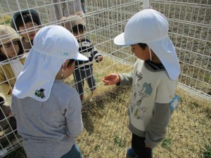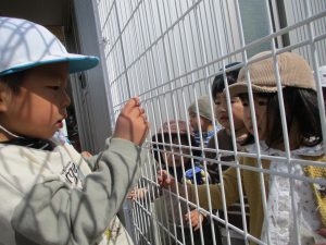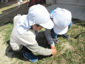 年中、年長さんに優しくしてもらった経験から、小さい子に優しく接する姿に成長を感じました。外に出ると、「わぁ〜、あったかい!」と春の暖かい陽気に喜び、ジャンバーを脱ぐ子ども達。身近な自然に触れ、友達と発見を喜んだり共有したり、のびのびと遊んでほしいと思います。