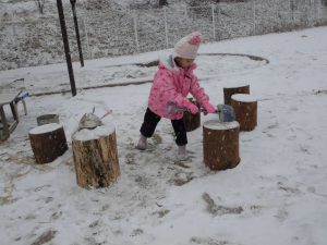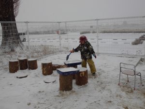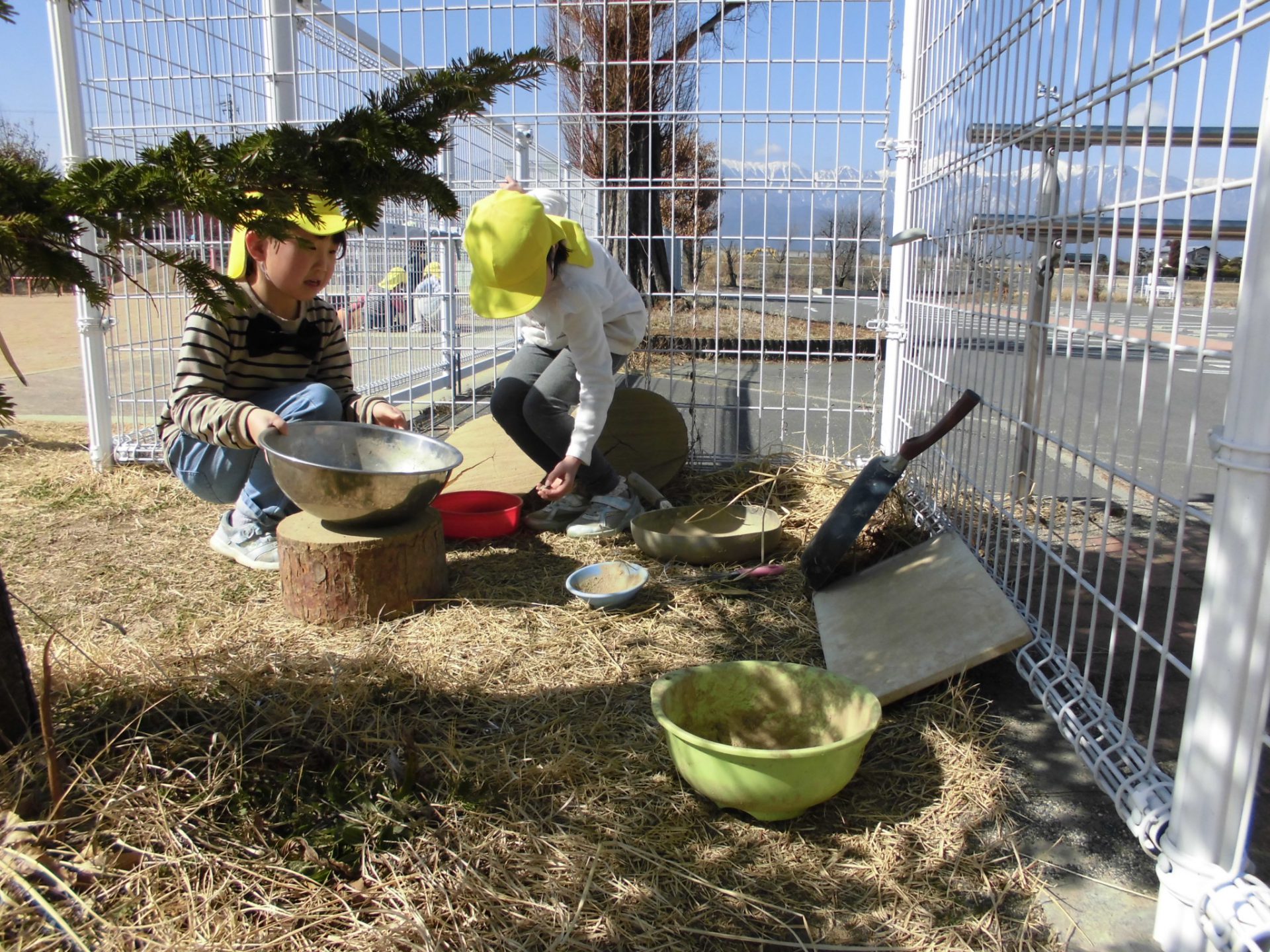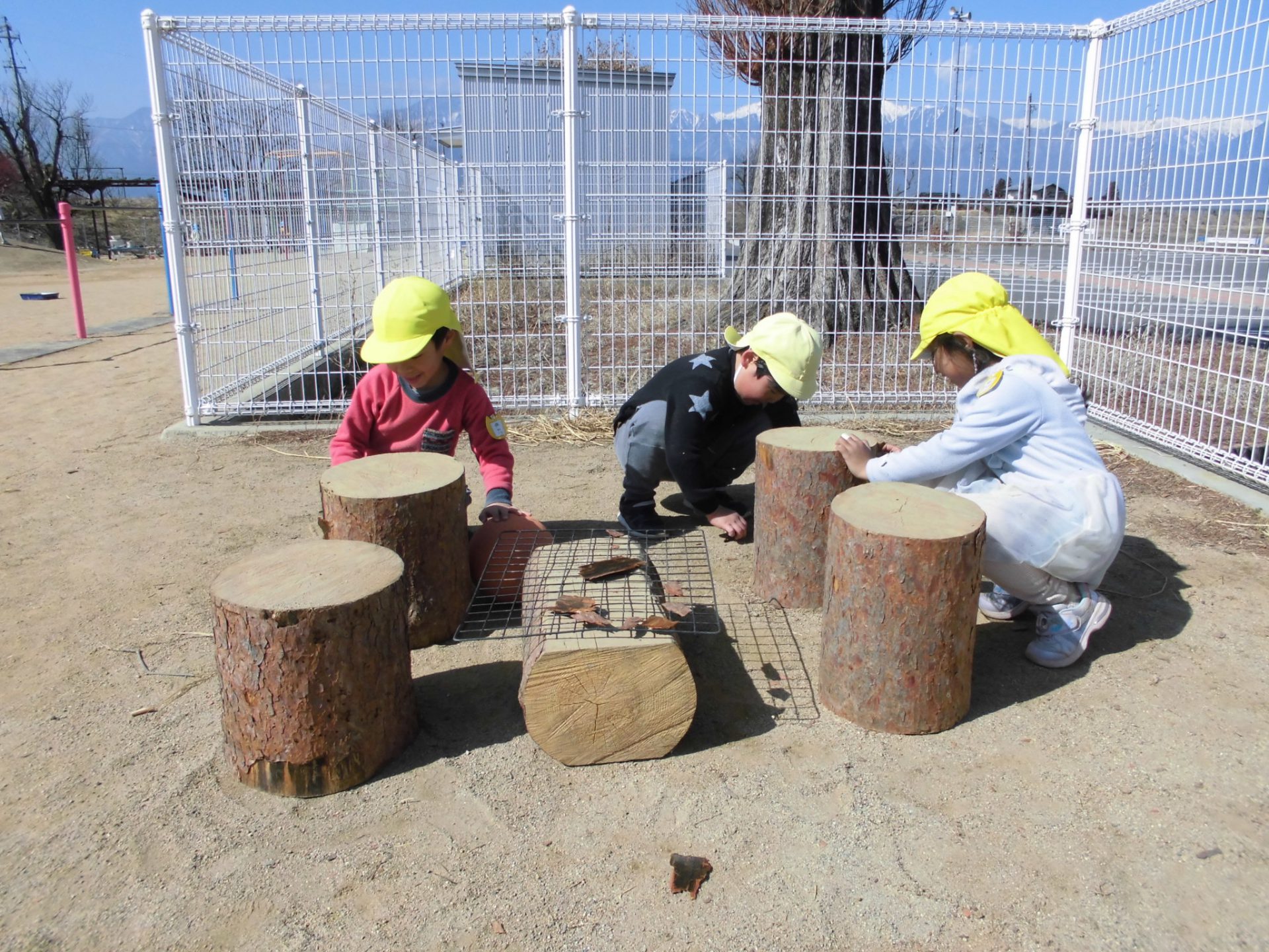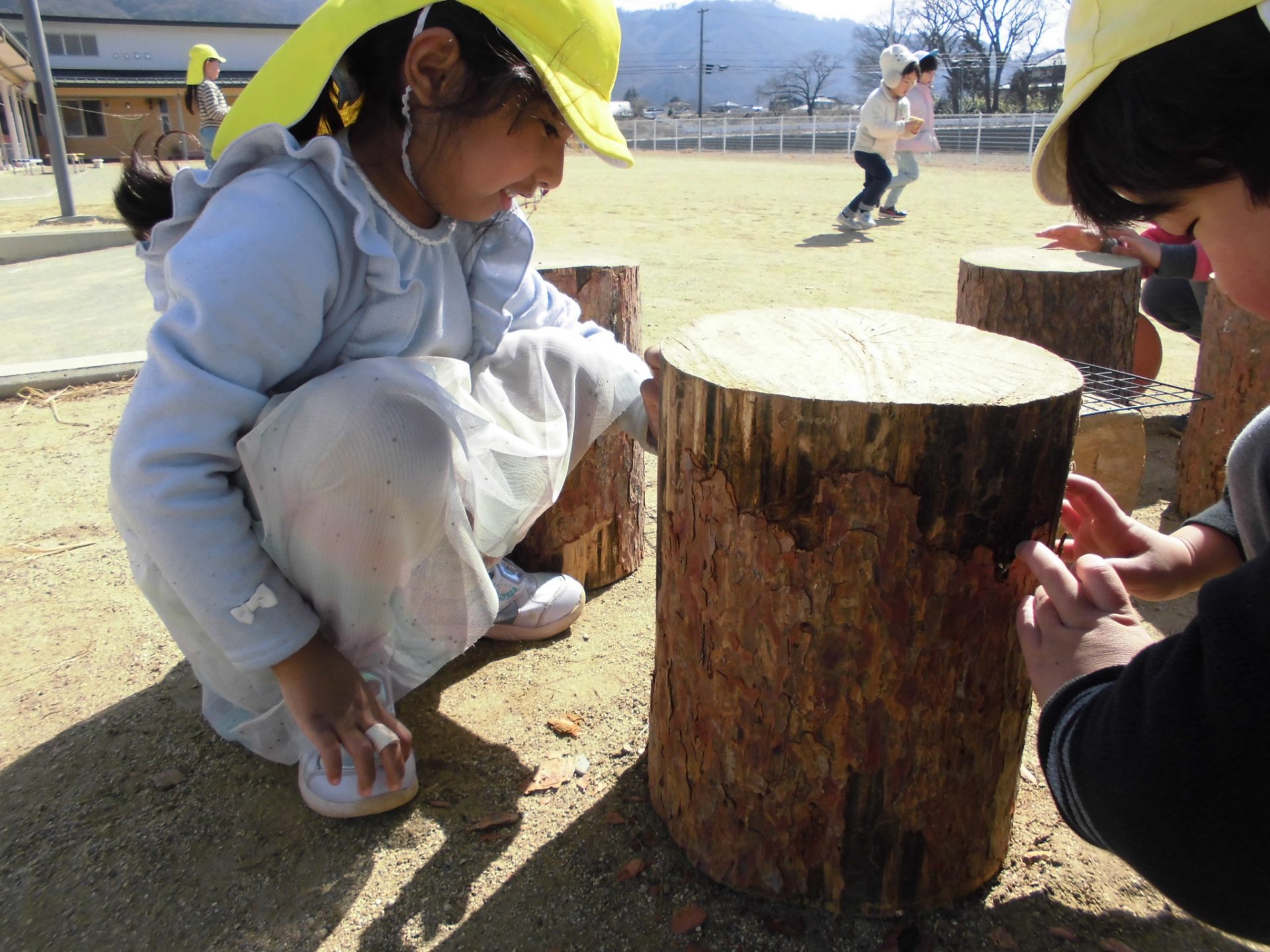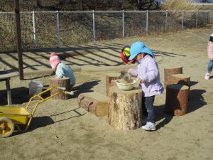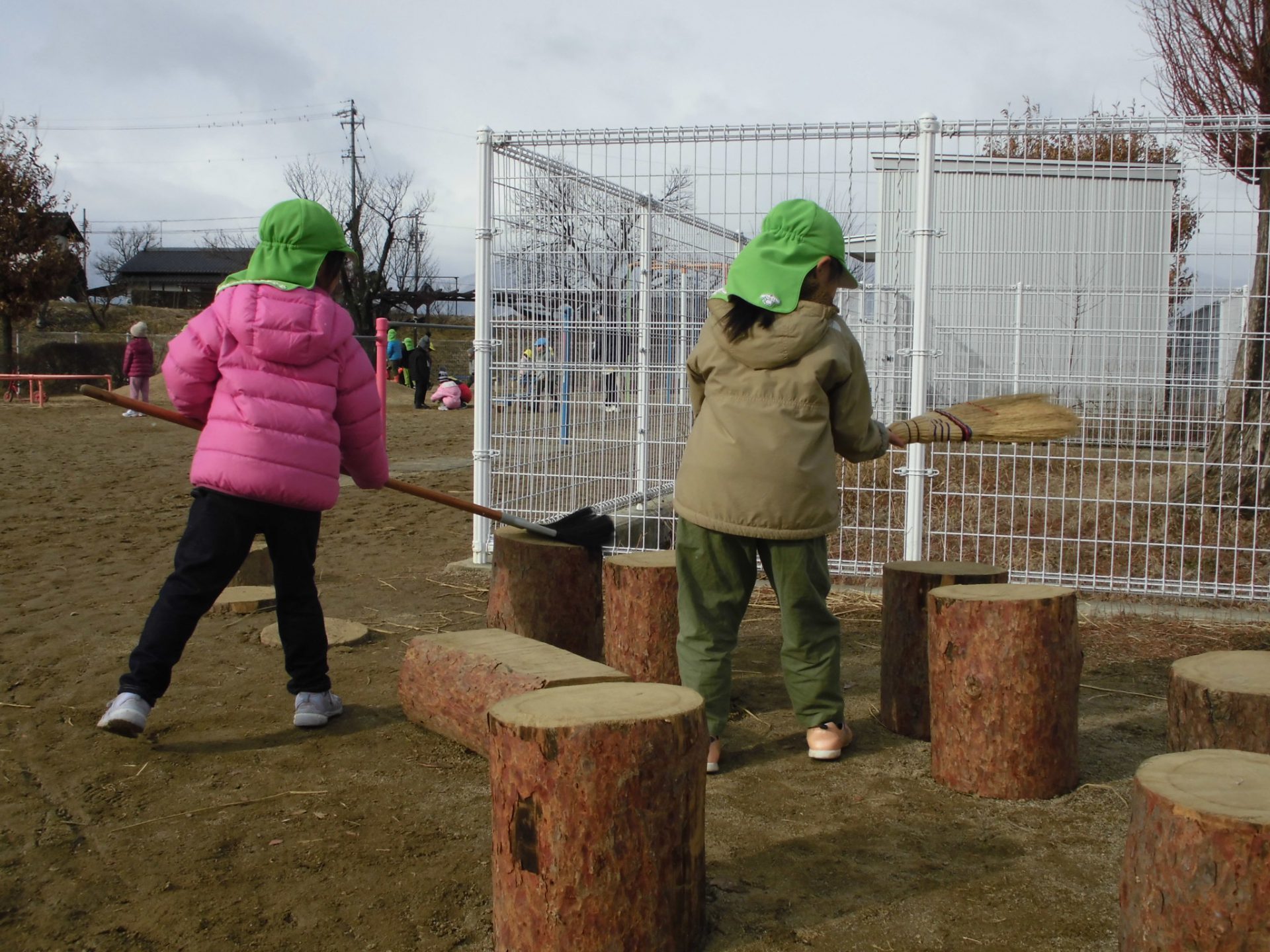 「そうだ!きれいにしよう!」「せんせい、ほうきある?」と年中のはぁちゃん、さぁちゃんコンビで、2箇所の丸太コーナーの掃除をはじめました。