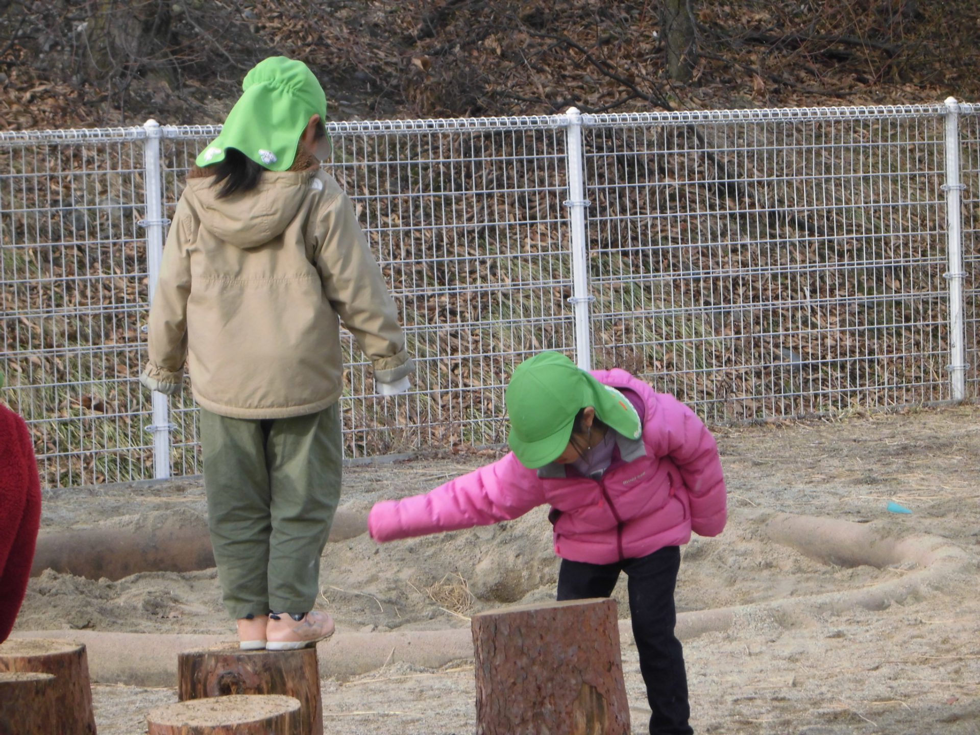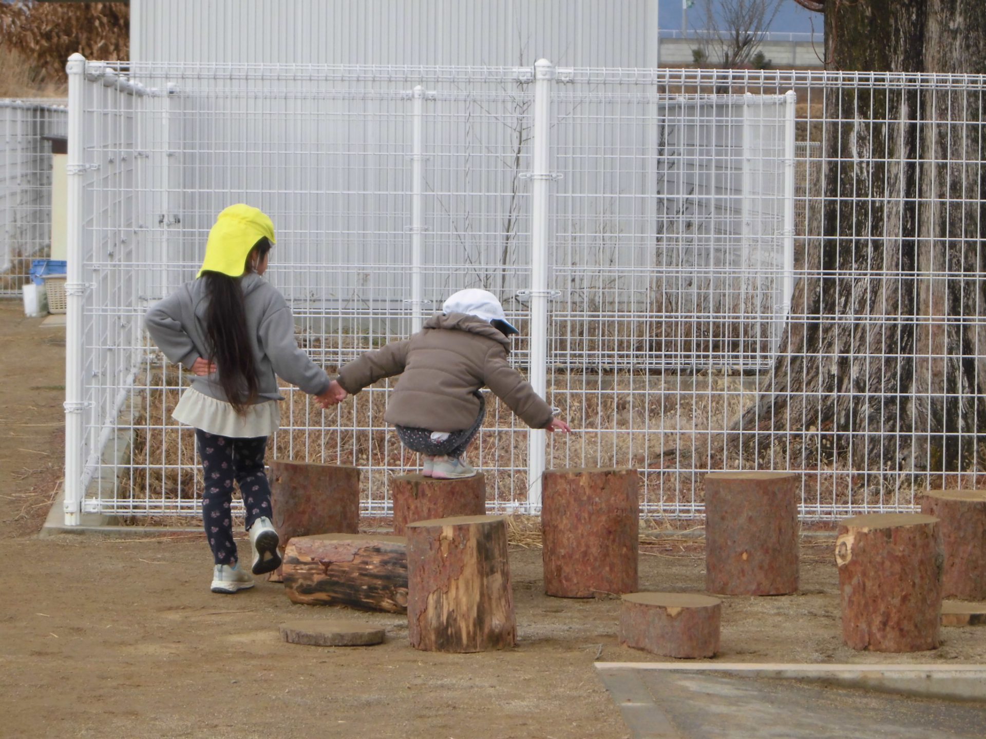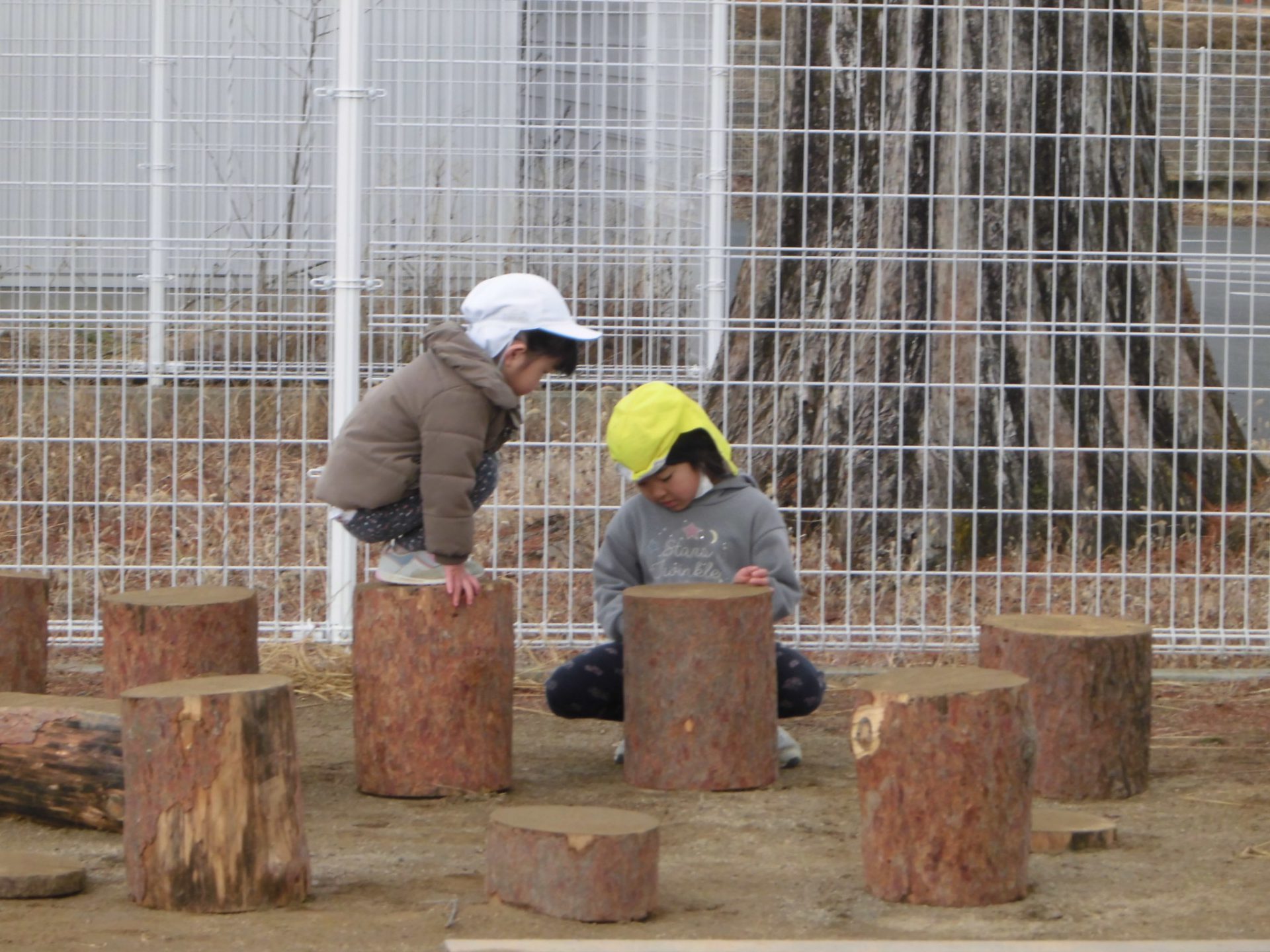 おままごとや、ごっこ遊びの基地となるだろうという大人の予想に反して、子ども達はすぐに丸太に飛び乗り、「落ちないで渡れた人が勝ちね!」とアスレチックとして楽しんでいました。