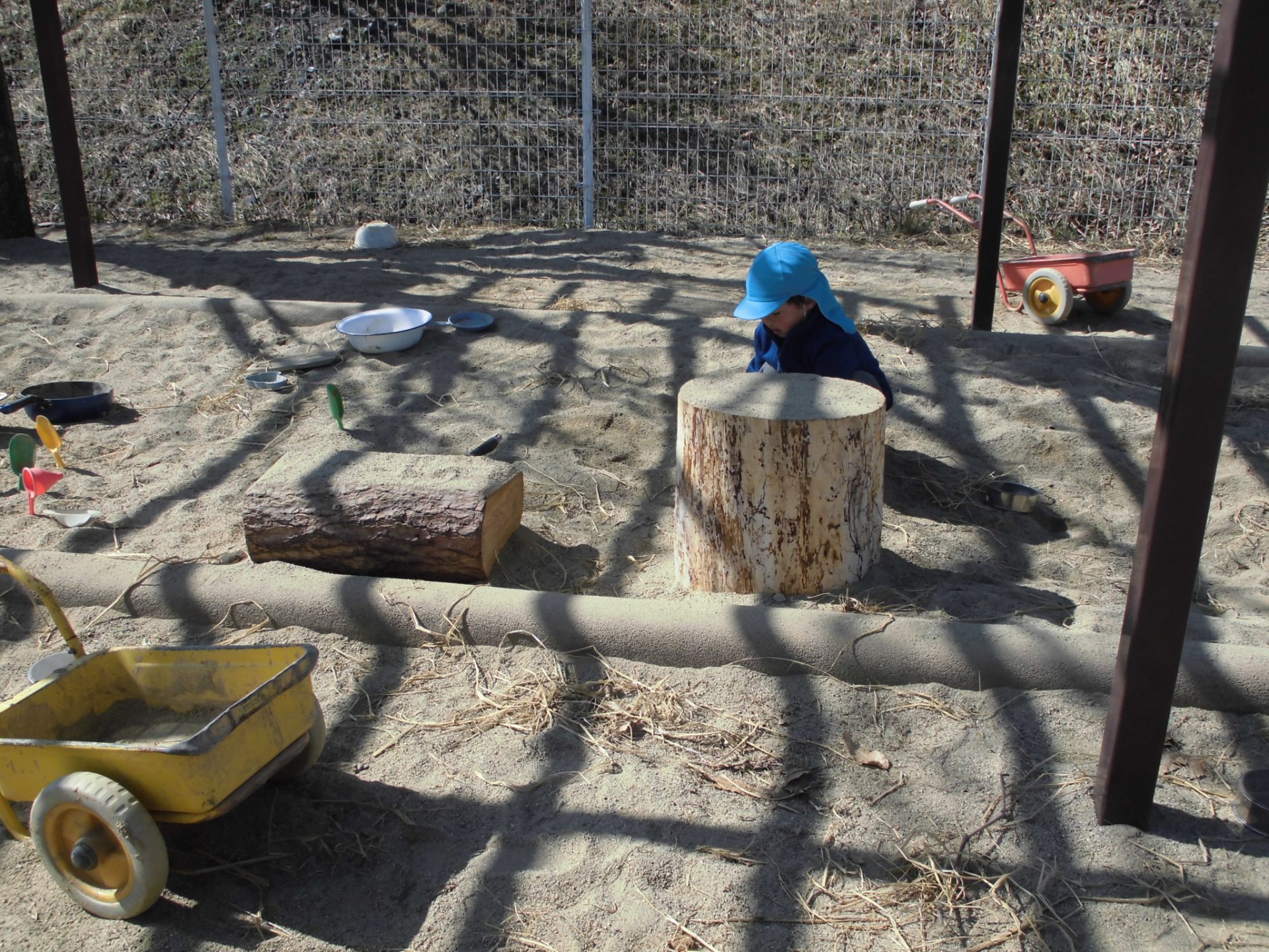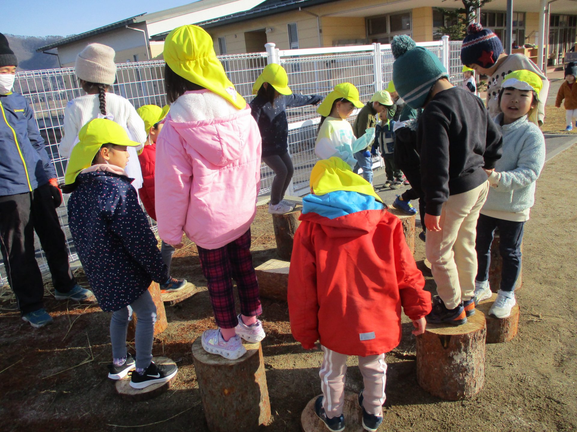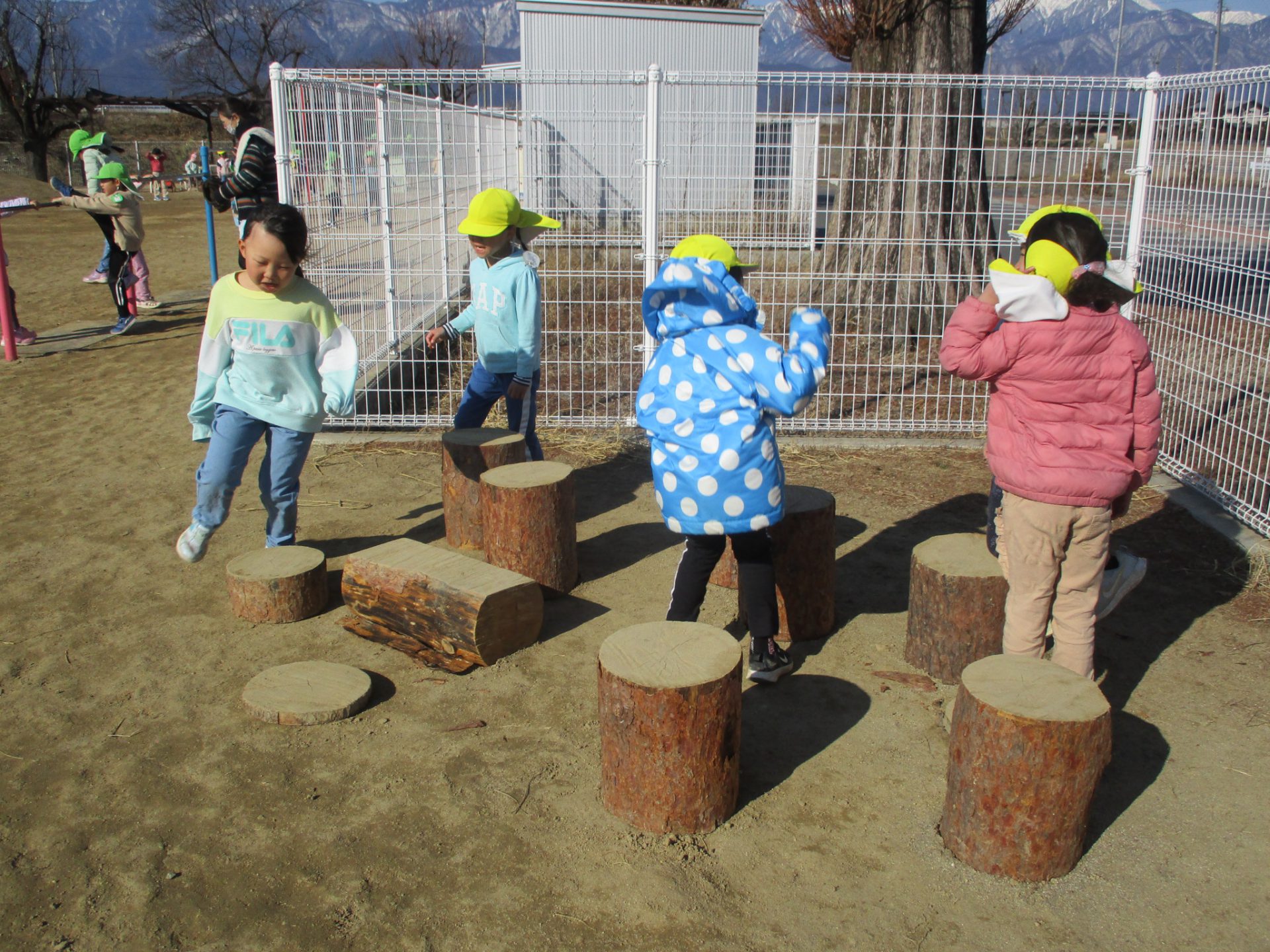 おままごとや、ごっこ遊びの基地となるだろうという大人の予想に反して、子ども達はすぐに丸太に飛び乗り、「落ちないで渡れた人が勝ちね!」とアスレチックとして楽しんでいました。