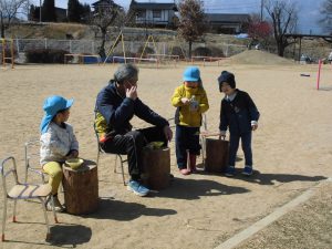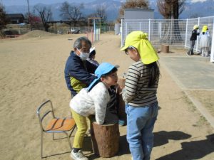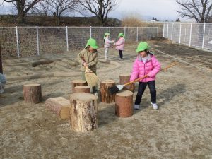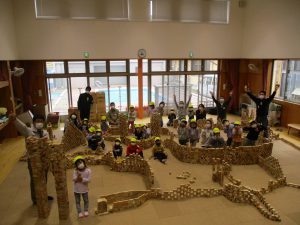 今年度、当園に「積み木キャラバン隊」が来て下さったことで、子ども達はより身近に”木”・・・それも安曇野市の木材、くくじいの『赤松』に触れる機会がもてました。「松枯れ」という言葉を初めて耳にした子ども達も多く、本当の理解はまだまだ難しいと思いますが、小さい頃から触れて、親しんだ木材のことに、そして自分達が暮らすこの地域の自然に近い将来興味関心をもってもらえたらと願っています。