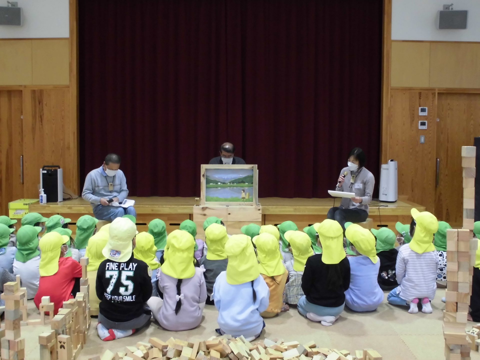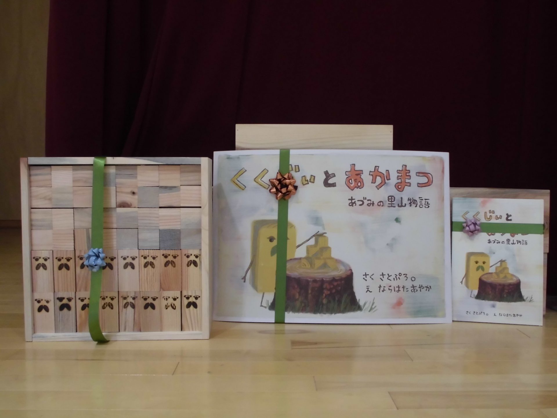 最後に”くくじい”の刻印がある、積み木と大型紙芝居・絵本をプレゼントに頂きました。
