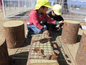 「これとれるね〜」と気づいたひぃちゃん。「これ木の皮じゃん!」とつぅくん。「お肉みたい!」「ほんとだね!」