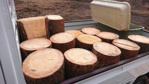 キャラバン隊でもお世話になった市の方が、”松枯れ”の赤松材で作った丸太セットを届けてくださいました!