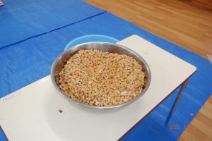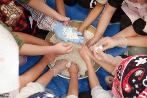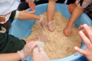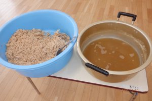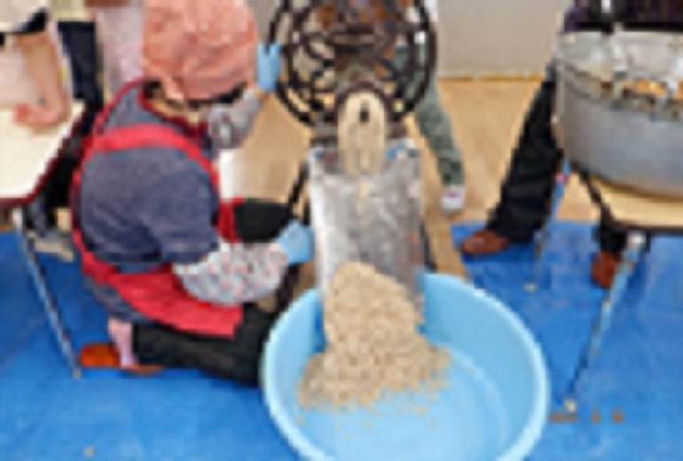 ・「甘い、お米みたい!」「麹を入れるとおいしいお味噌になるんだよ。」