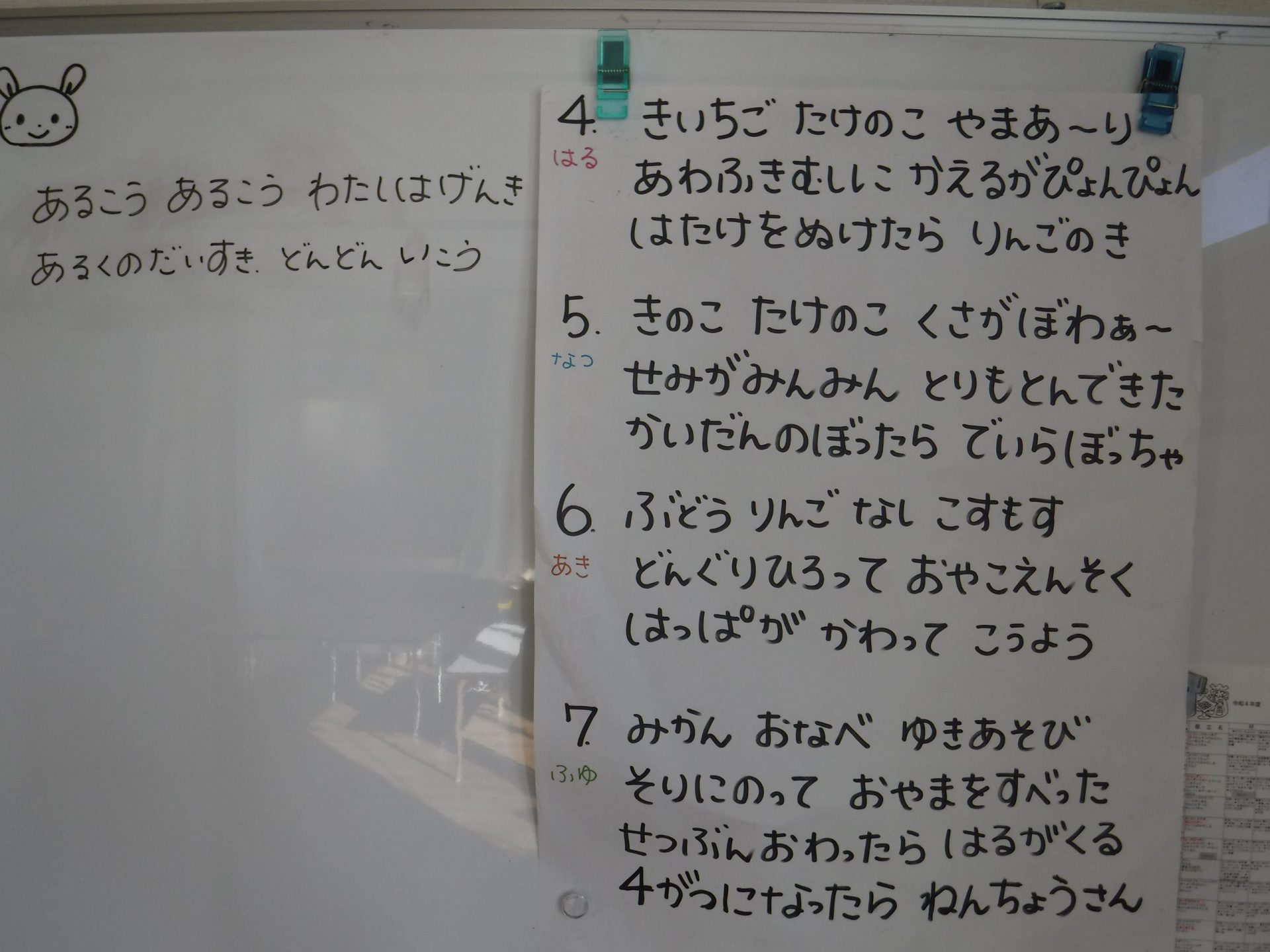 いろいろな活動をしたり、自然を感じ「夏って?」「秋何した?」・・・とその季節にやってみたこと、感じたことをホワイトボードに書いていきました。