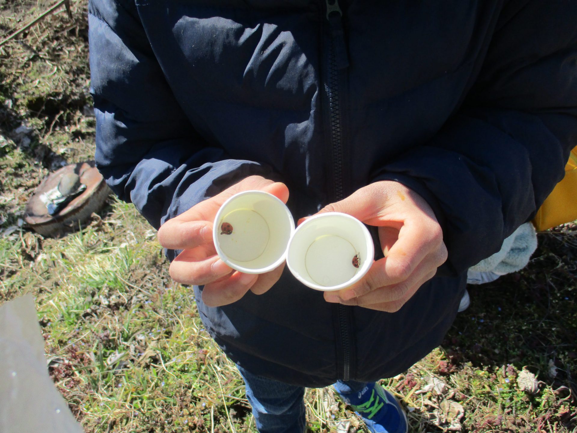 「みてみて、てんとうむしみつけたよ」「かわいい〜」