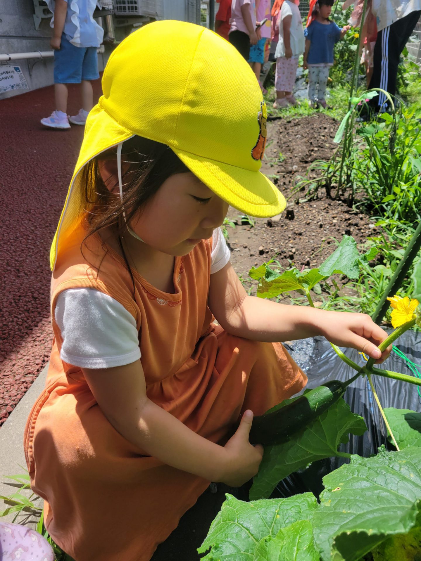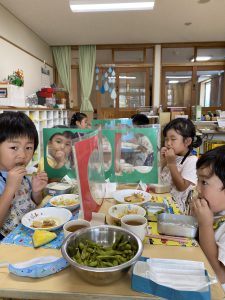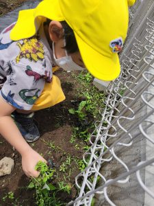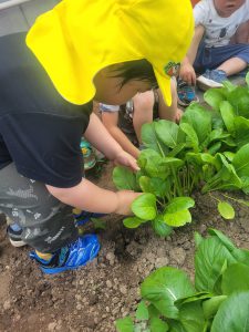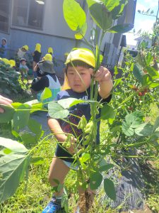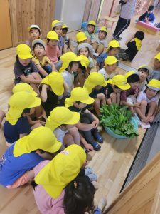 何事にも全力の年中さんは畑づくりも種まき、苗植え、草むしり、収穫を友達と力を合わせ楽しんでいました。給食の先生にも協力していただき給食に入れてもらい、自分たちの作った野菜を美味しそうに食べる姿や、野菜が苦手な子も自分が作った野菜ということもあり、普段なら口にしないが食べてみたりしていました。また、味も違うようでいつも以上に美味しそうにおかわりもしてみんなでたくさん食べました。