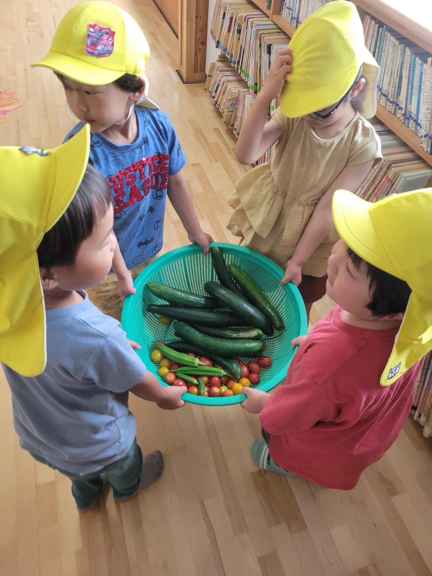 きゅうり・トマト・ミニトマト・オクラ・小松菜・おかひじき・枝豆とたくさんの野菜が収穫でき、給食の先生にお昼に入れてもらいました。