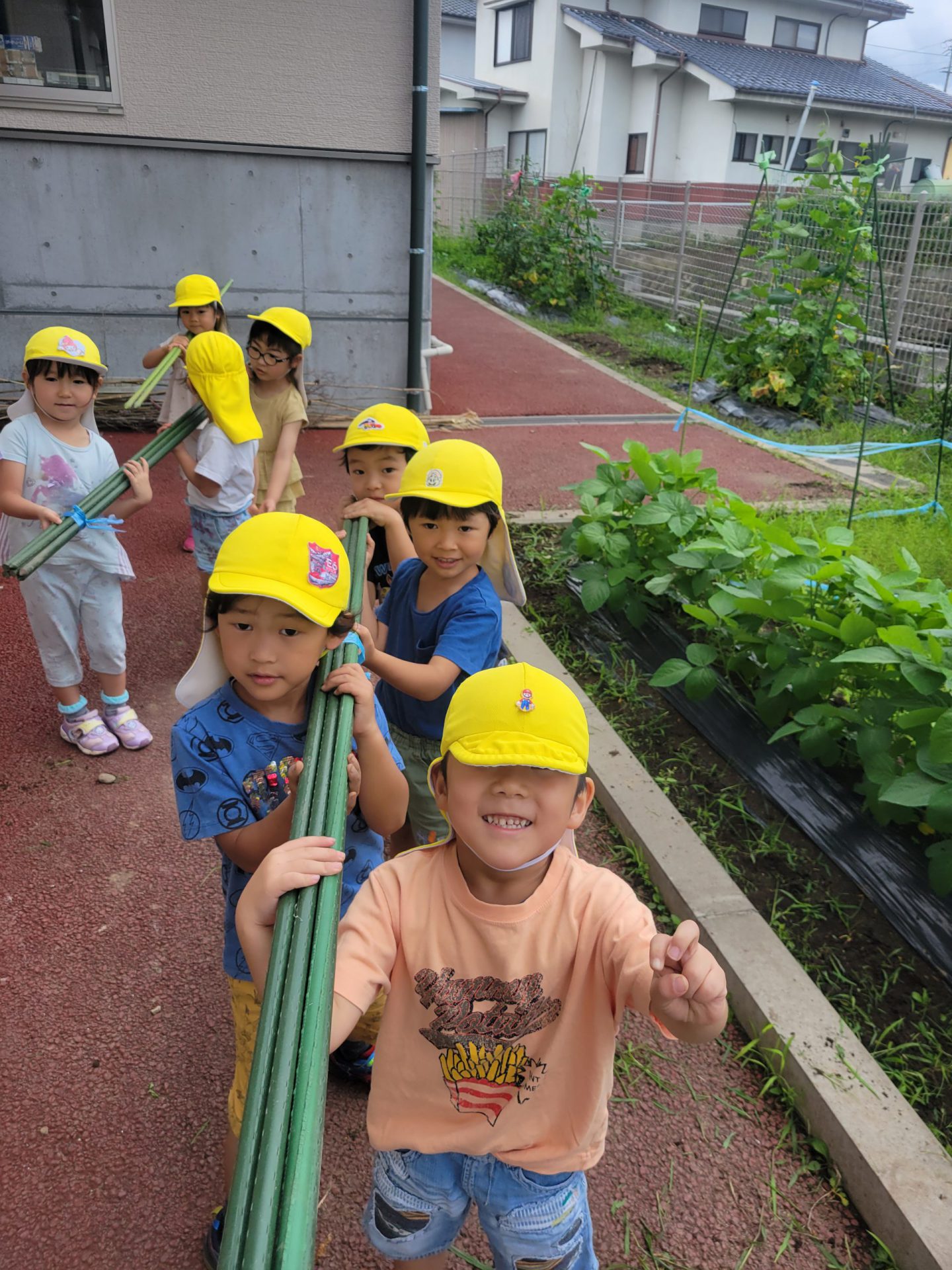 大きくなった野菜たちのお家が小さくなってしまったのでみんなで支柱を運んだよ!