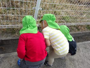 「こっちに来て。アリがいるんだよ!」「お花が咲いているところに連れて行ってあげる!」とうれしそうに保育士を呼びに来てくれる子ども達。身近な自然の変化に気付き、発見したことを友達と共有しながらたくさんの春を見つけて楽しんでほしいです。また、自然に触れる中で、植物や生き物を大切にする気持ちをもてるようになってほしいです。