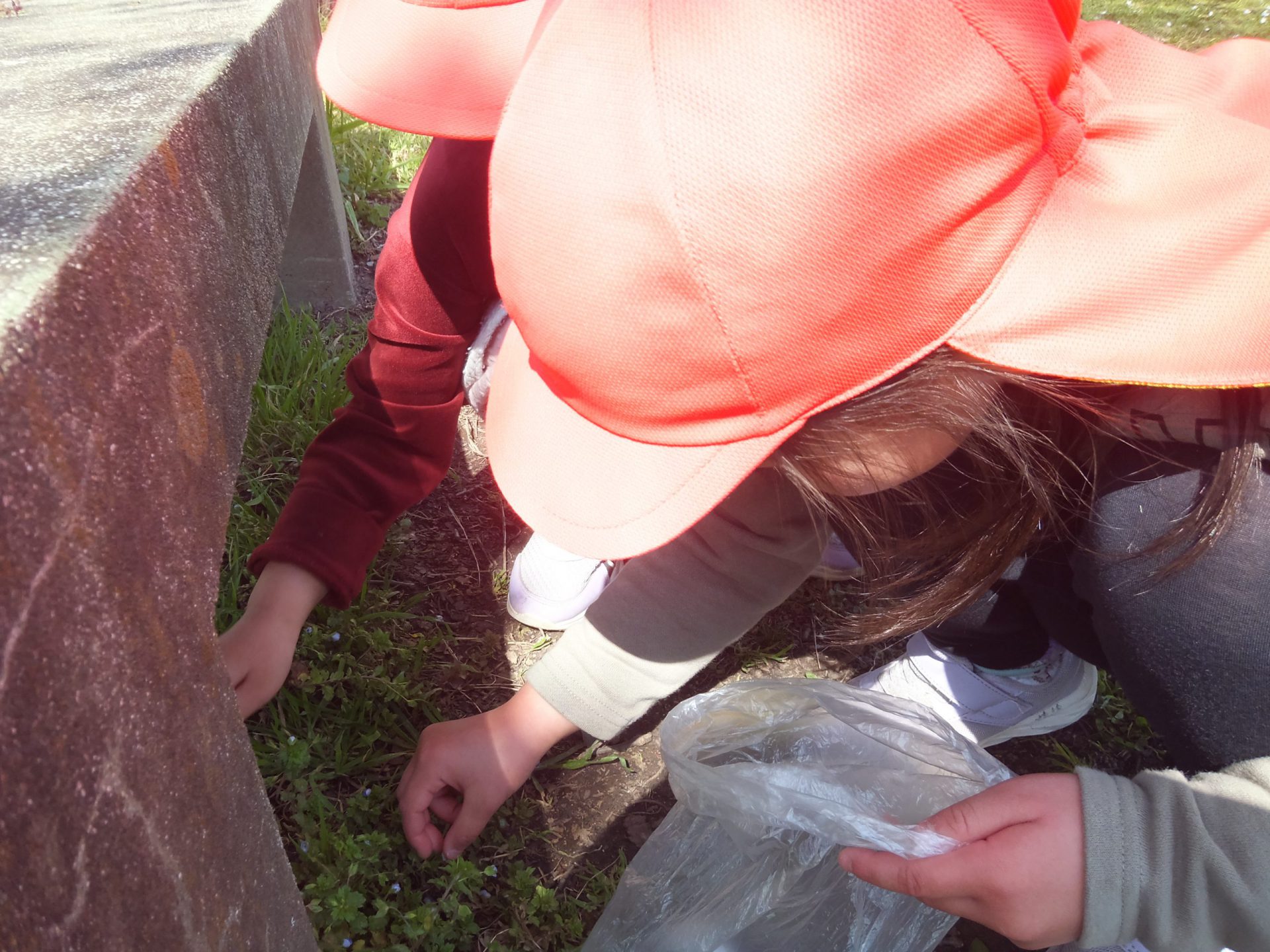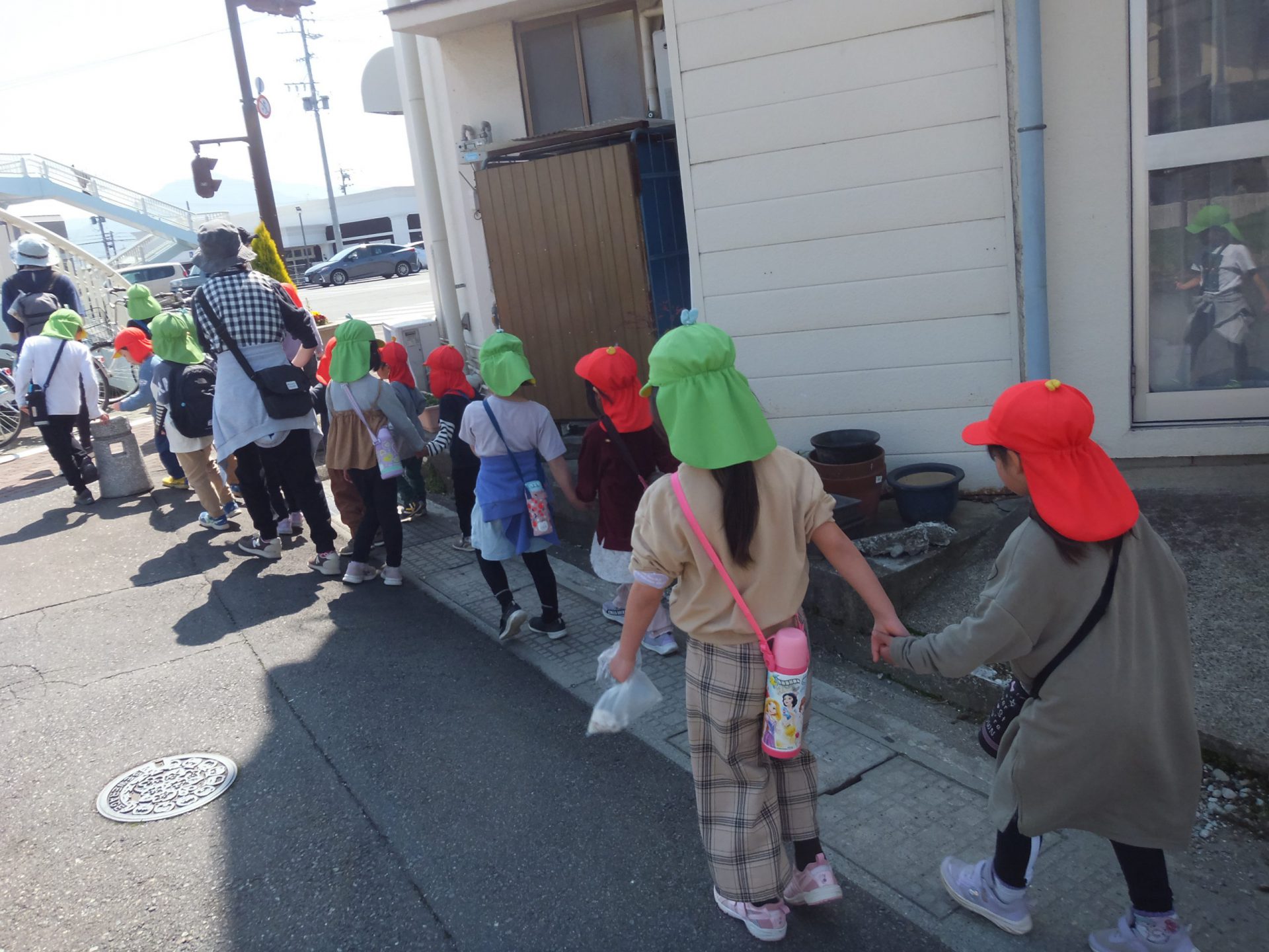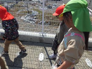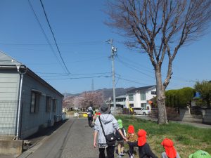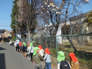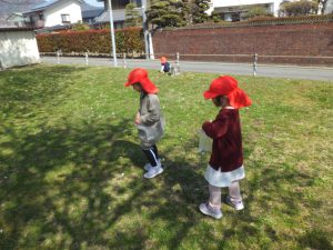 暖かい陽気の中、年少児と年長児合同で、散歩に行くことにしました。