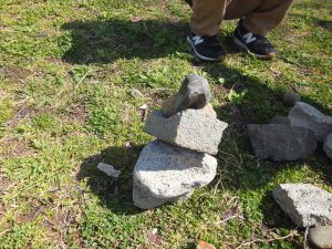 「こんなところにあった!青、黄色、白のお花!」石陰にひっそりと咲く小さい花を見つけました。