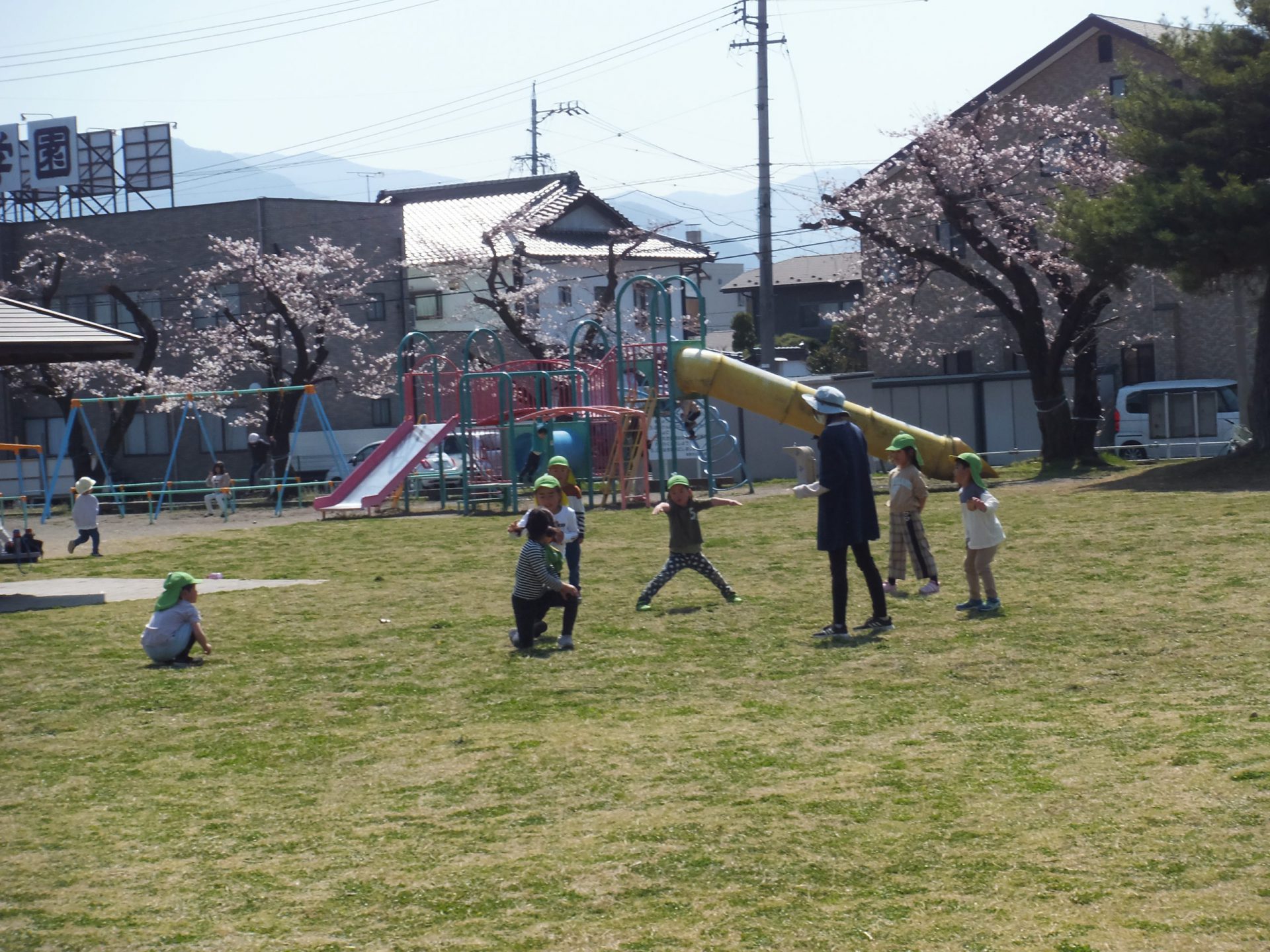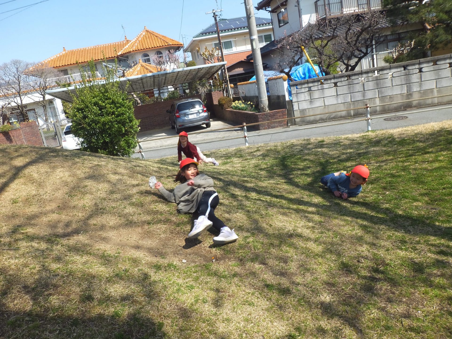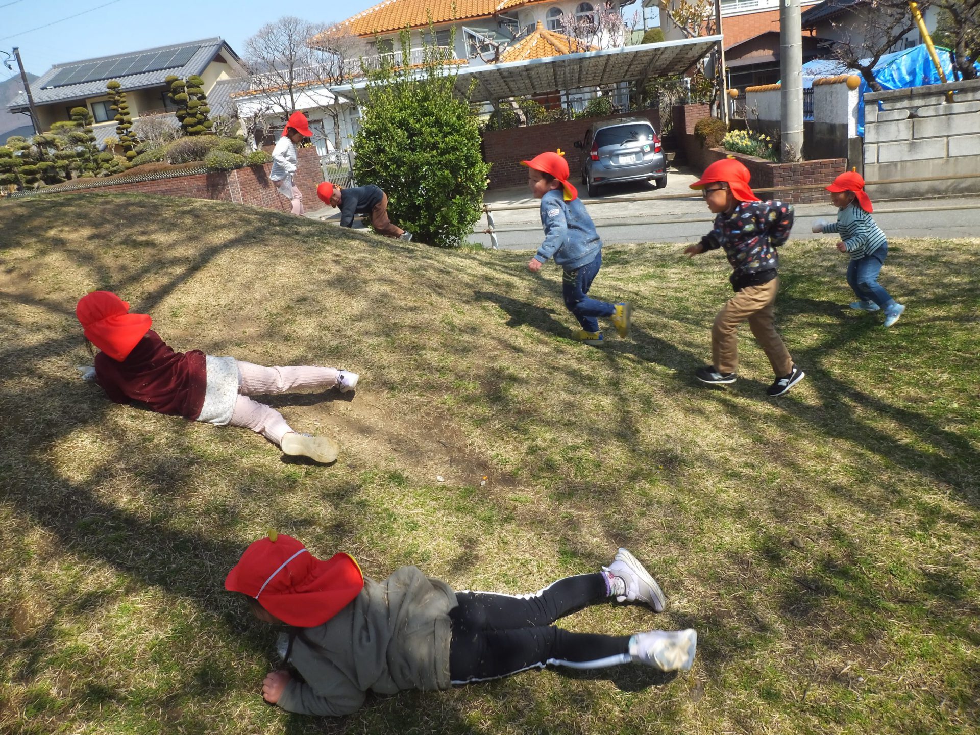・秋頃から、異年齢で活動する機会を多く設けてきました。はじめは緊張していた子ども達も、今では異年齢の友達と散歩に行くのを楽しみにするようになりました。今日は、春の自然を探して遊びに取り入れたり、友達と思い切り体を動かして遊ぶ姿が見られました。年長さん、小学校に行っても元気でね!今まで、小さい子のお世話をありがとう。年少さんは、これからもたくさん散歩に出かけて、自然の中でたくさん遊びましょう。