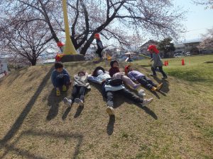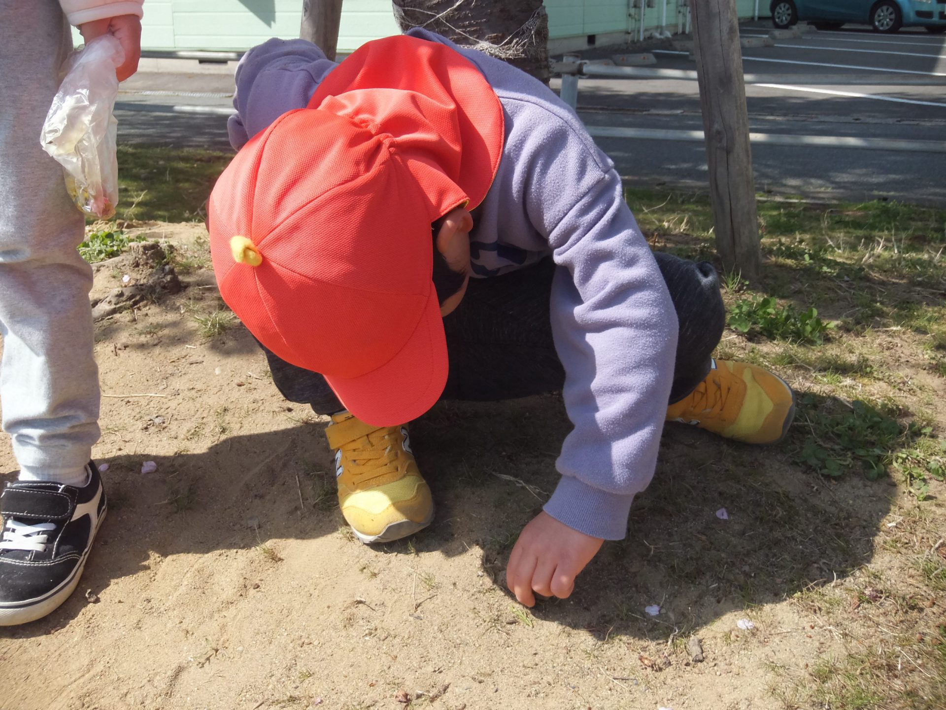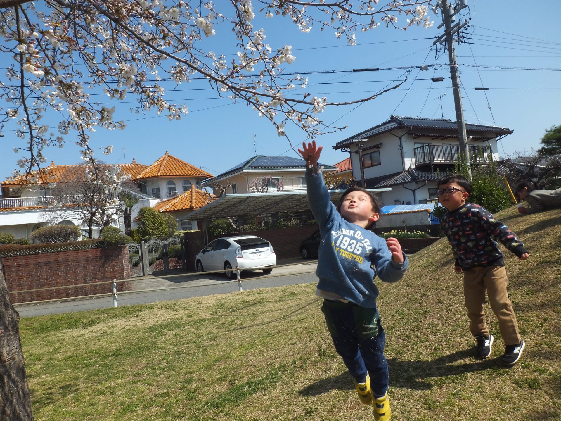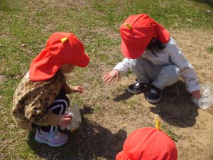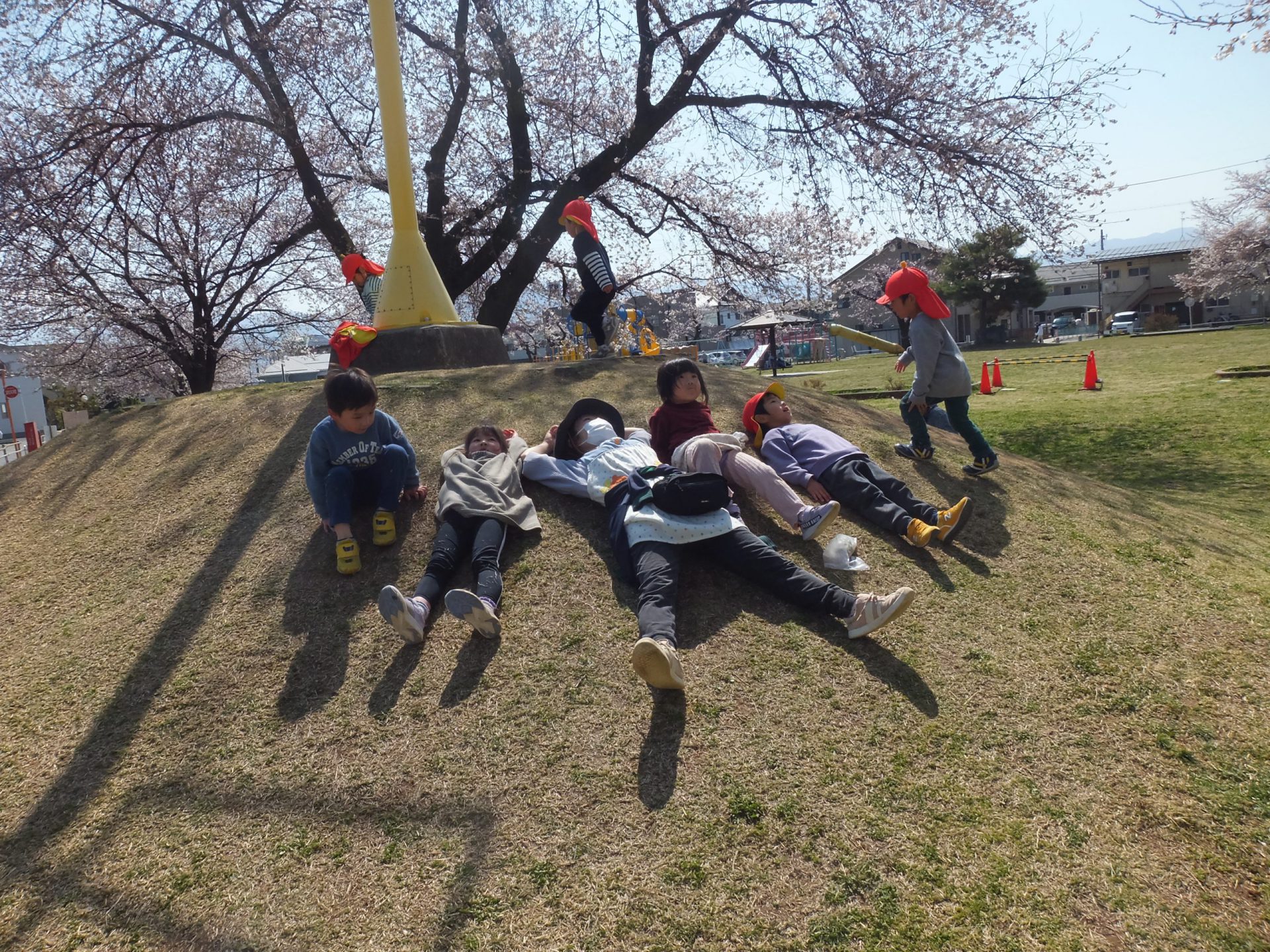 ・秋頃から、異年齢で活動する機会を多く設けてきました。はじめは緊張していた子ども達も、今では異年齢の友達と散歩に行くのを楽しみにするようになりました。今日は、春の自然を探して遊びに取り入れたり、友達と思い切り体を動かして遊ぶ姿が見られました。年長さん、小学校に行っても元気でね!今まで、小さい子のお世話をありがとう。年少さんは、これからもたくさん散歩に出かけて、自然の中でたくさん遊びましょう。