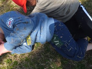 「山を転がっちゃおう!それっ!」「見てみて~!葉っぱがいっぱい付いちゃった!」葉っぱをたくさんつけて、みんなで大笑いです。