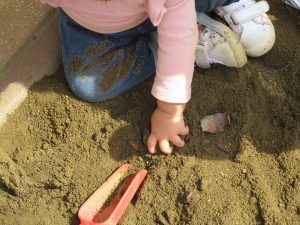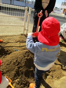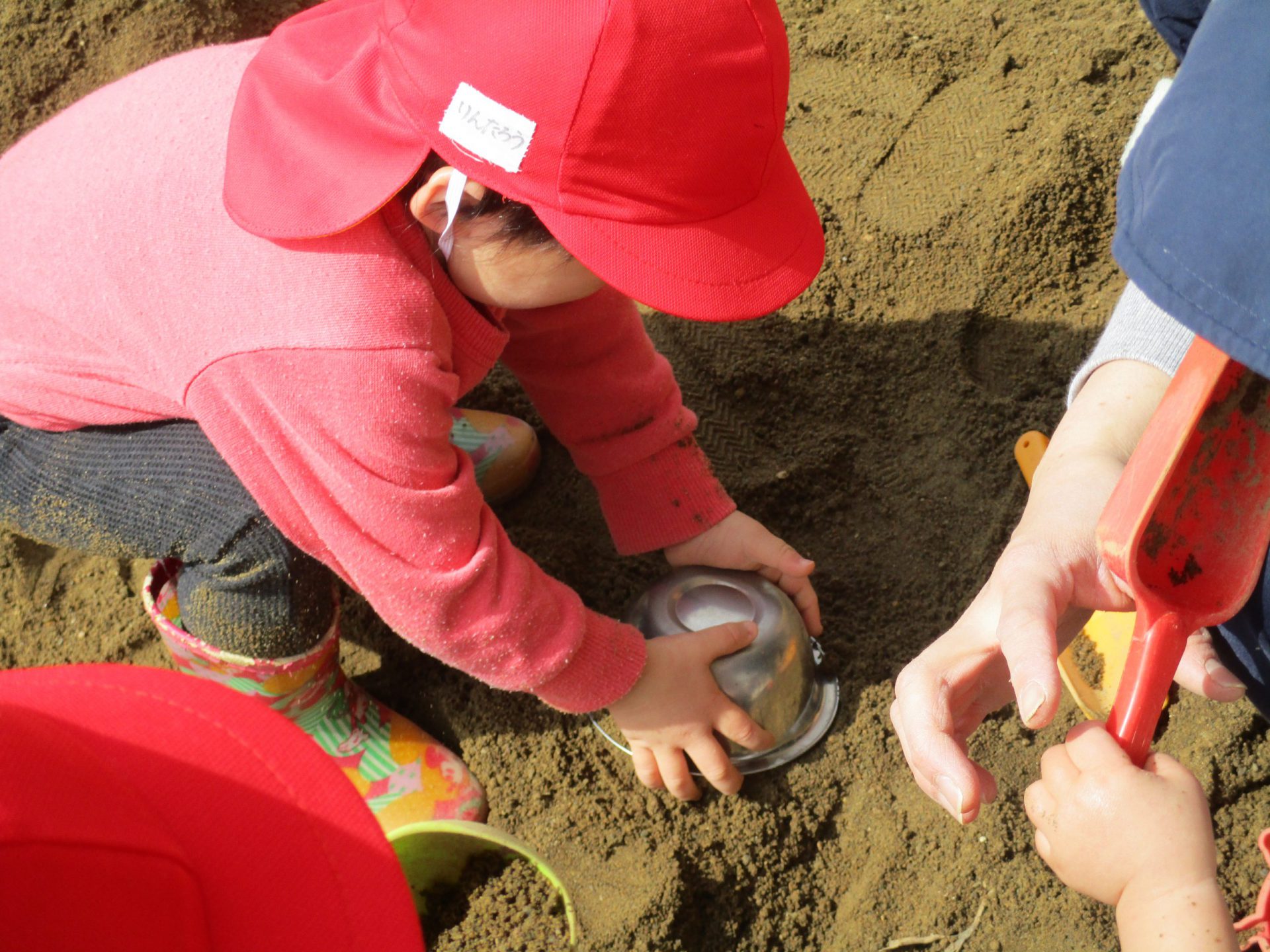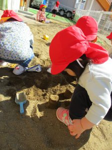 ・街中の保育園ですが、子どもたちにとって一番身近な園庭での砂遊びの中からもいろいろな発見があり、たくさんの楽しい経験ができることがわかりました。これからもこの園庭から、0歳児の子どもたちなりの楽しい経験を増やしていってほしいと思います。