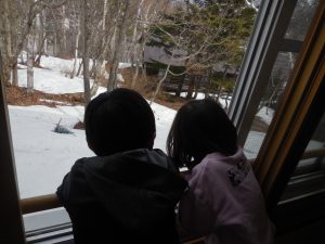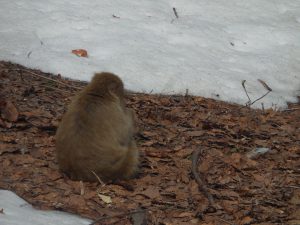 雪が解けて餌を探しにやってくるサル 保育室からじっとサルを観察・・・。
