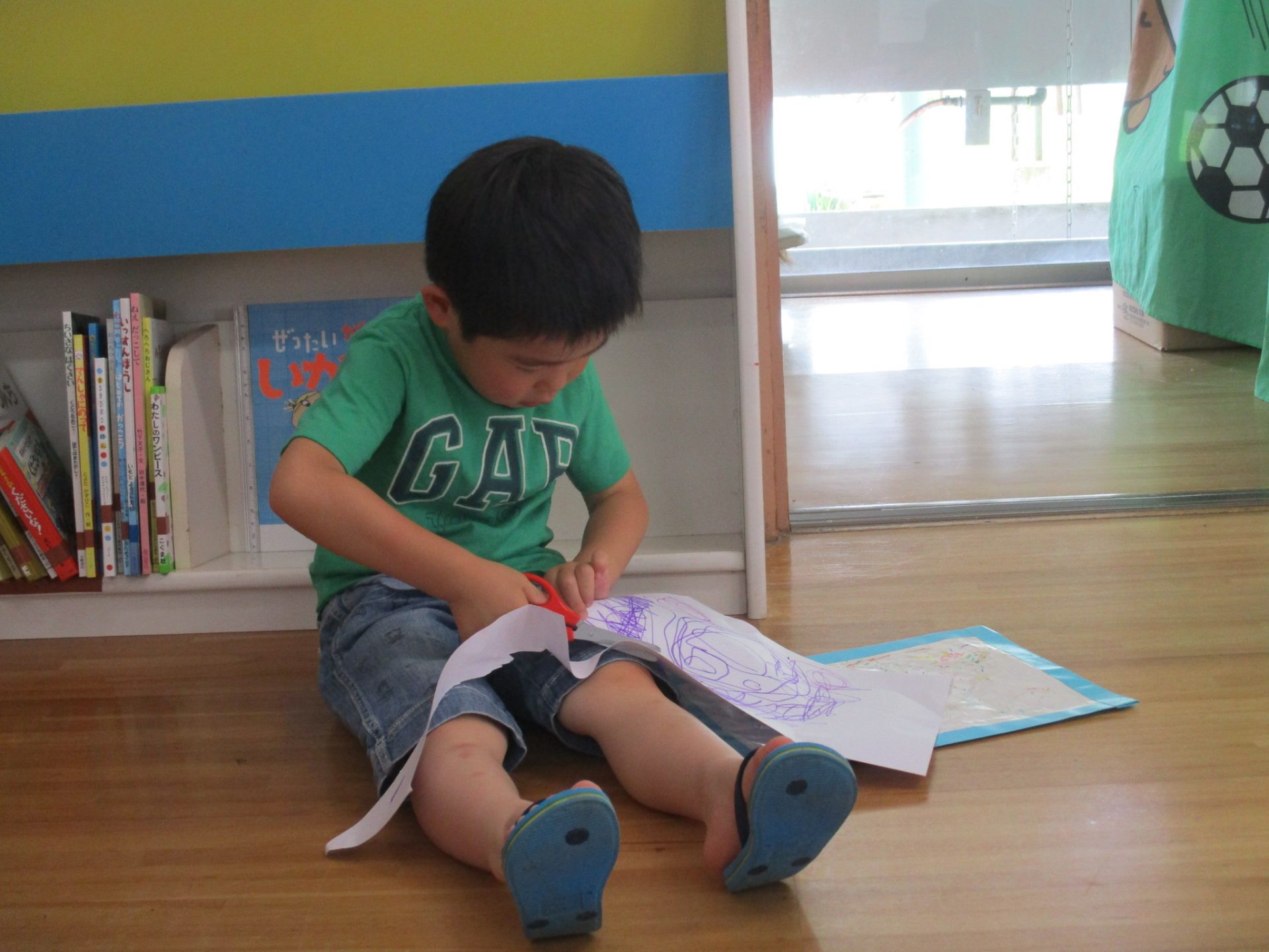 真似して描いたり、「クレヨンよりペンの方が怖いかも。」と道具を変えたり、はさみで切って怖くしようと切ったり、それぞれ工夫し始めました。この日はたっぷり怖い絵が出来上がりました。