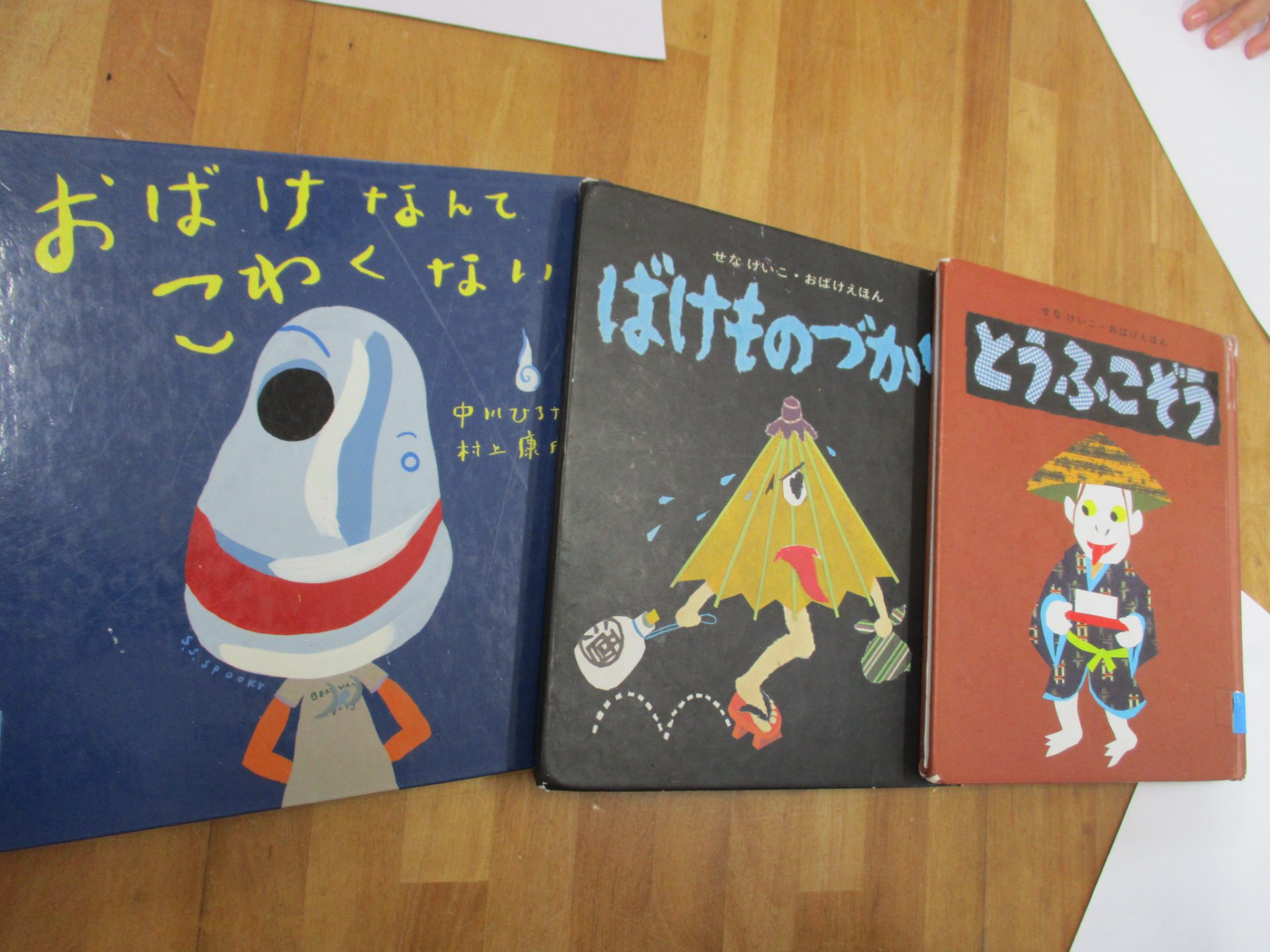 おばけの絵を書いて飾ろう!ということになり、紙に描き始めました。でも、「怖い絵って何を描けばいいの?」迷って描き出すことができない子もいました。すると絵本の部屋で製作していたので「これ見ながら描こう!」とおばけの本を発見!
