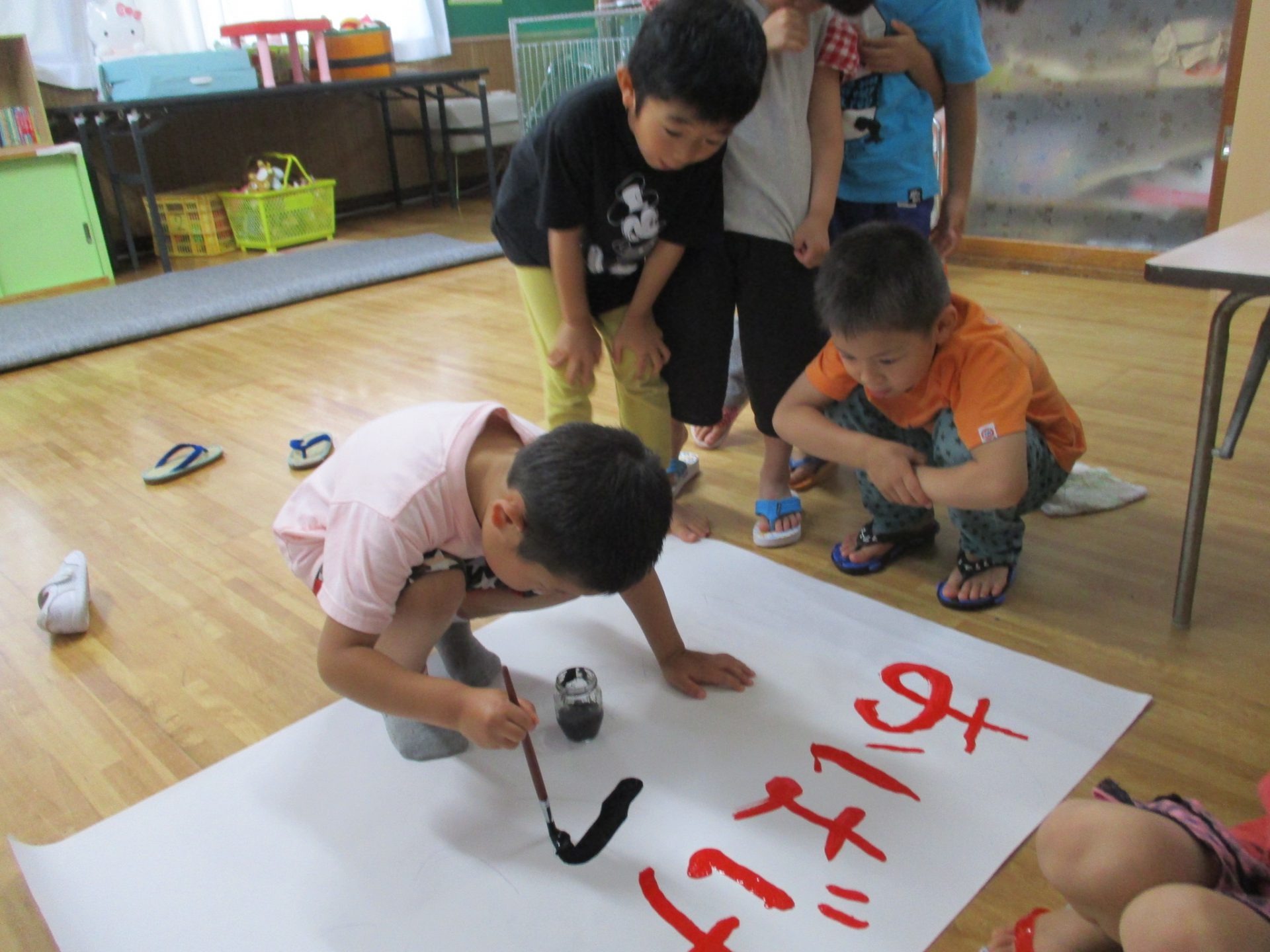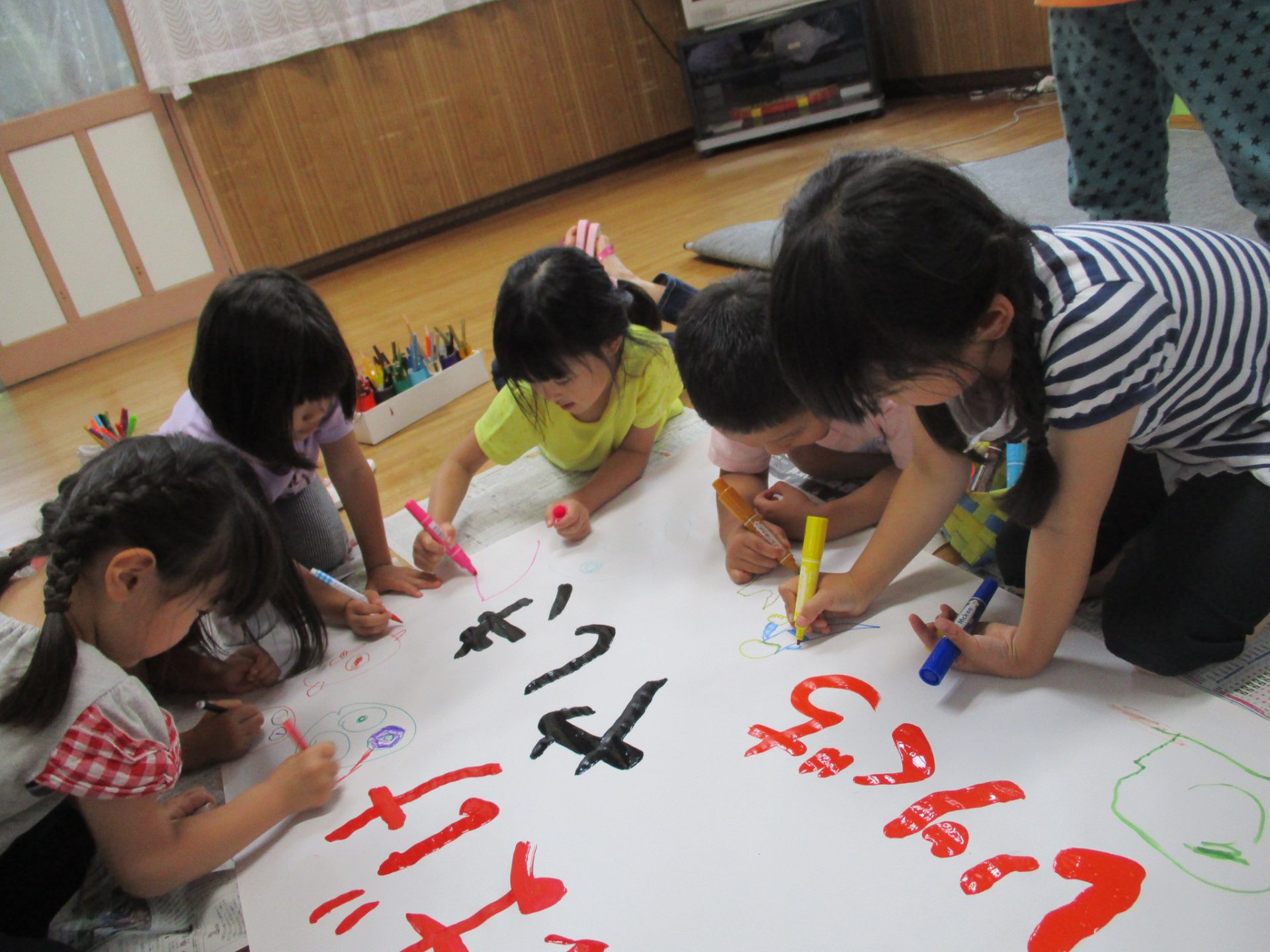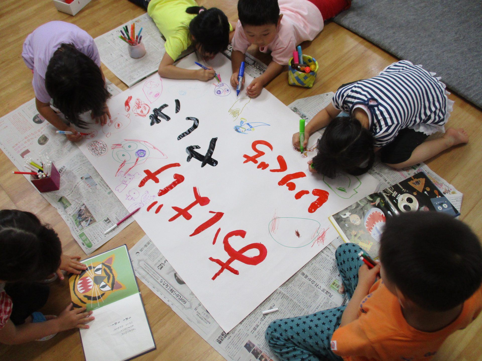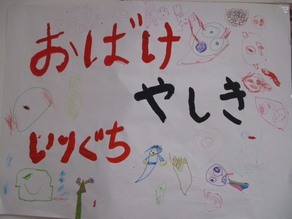 ここには写っていませんが、絵が苦手な子たちは、この間に「僕達洗ってくるねー!」と筆を洗いに行ってくれました。素晴らしいチームワーク!怖ーい看板の出来上がりです。