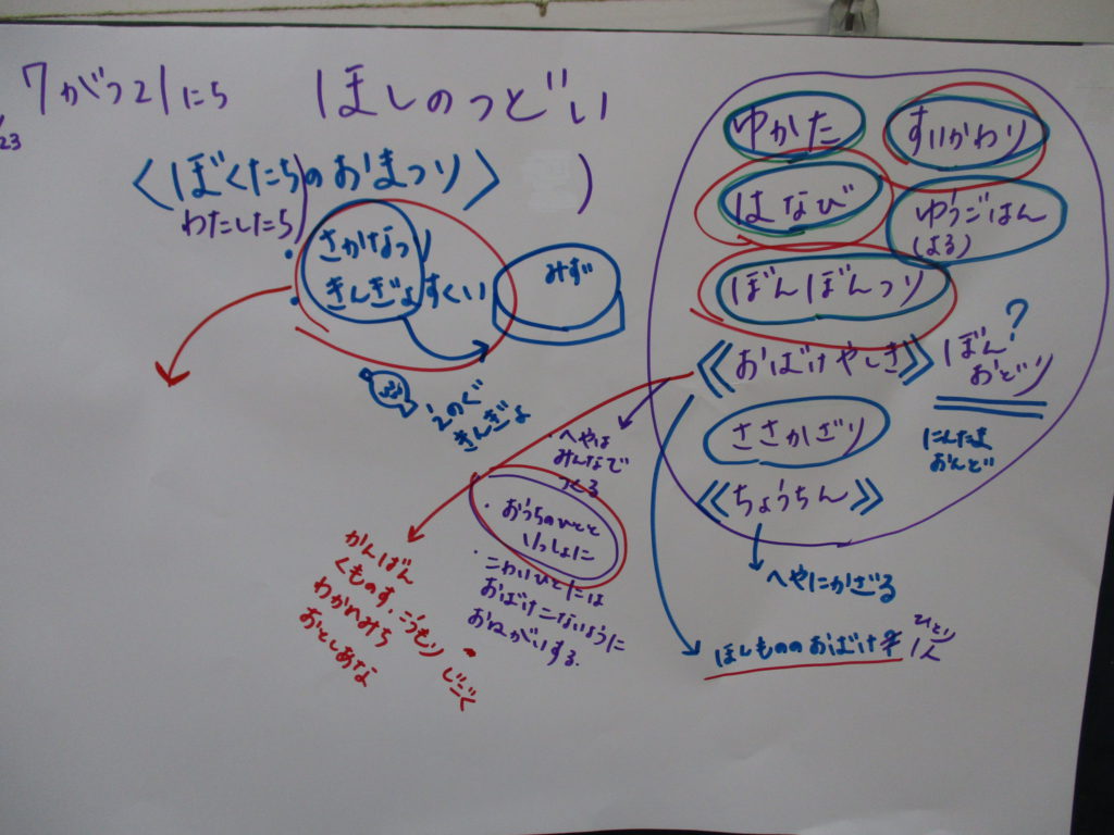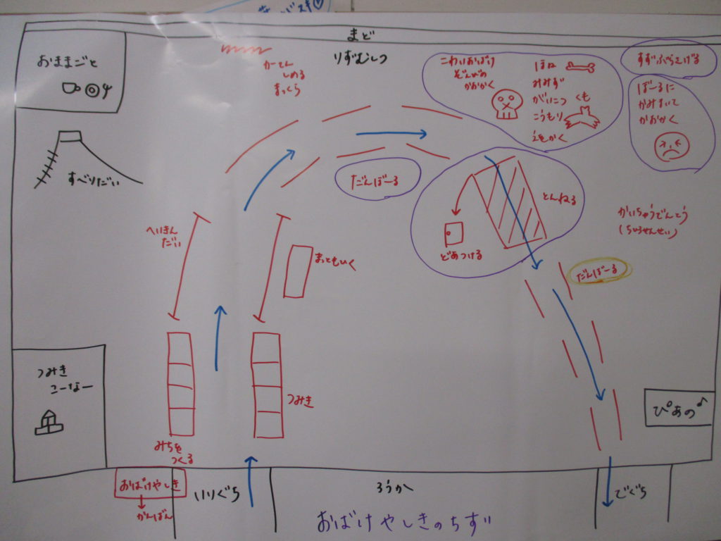 そしてこの日はおばけやしきの準備です。リズム室をおばけやしきにすると決めてから子どもたちの声を地図にしていきました。
