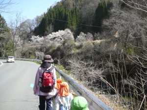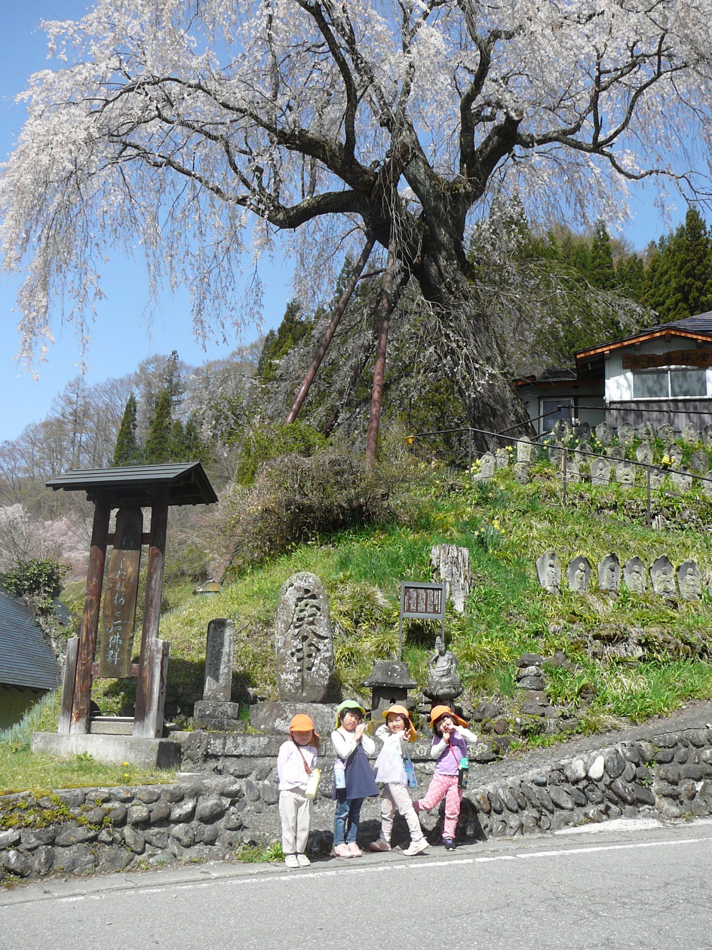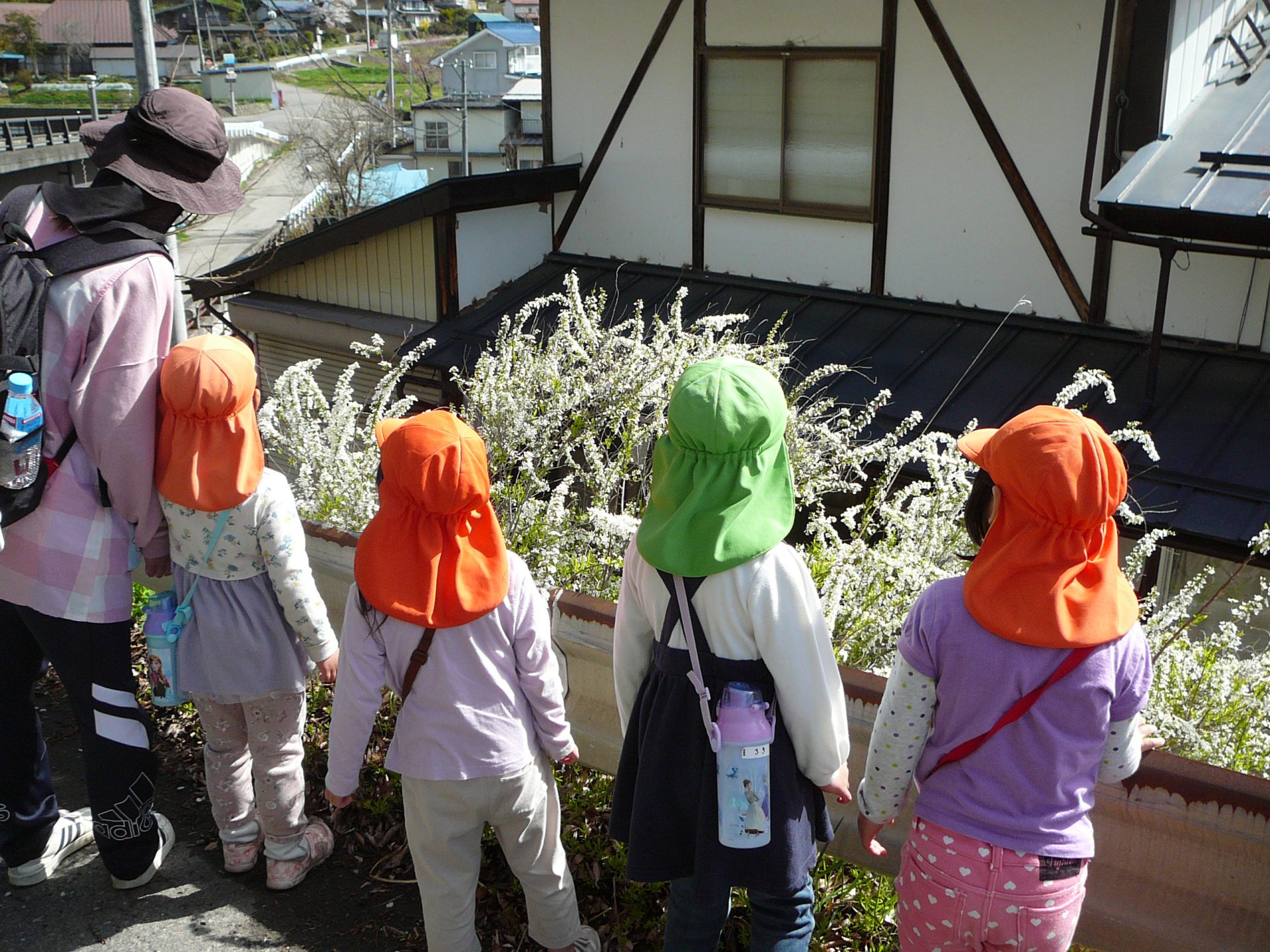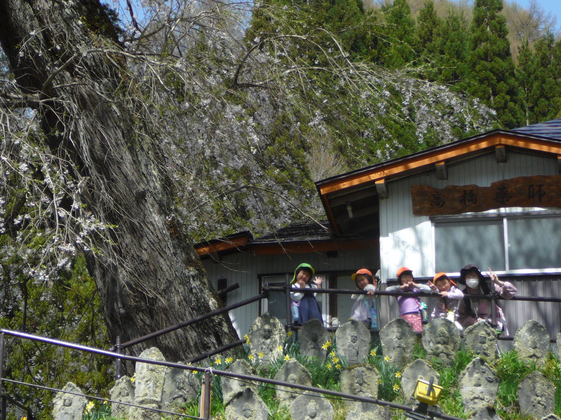 高橋のしだれ桜を見に出かけました。みんなで元気に出発です。「いってきまーす!」