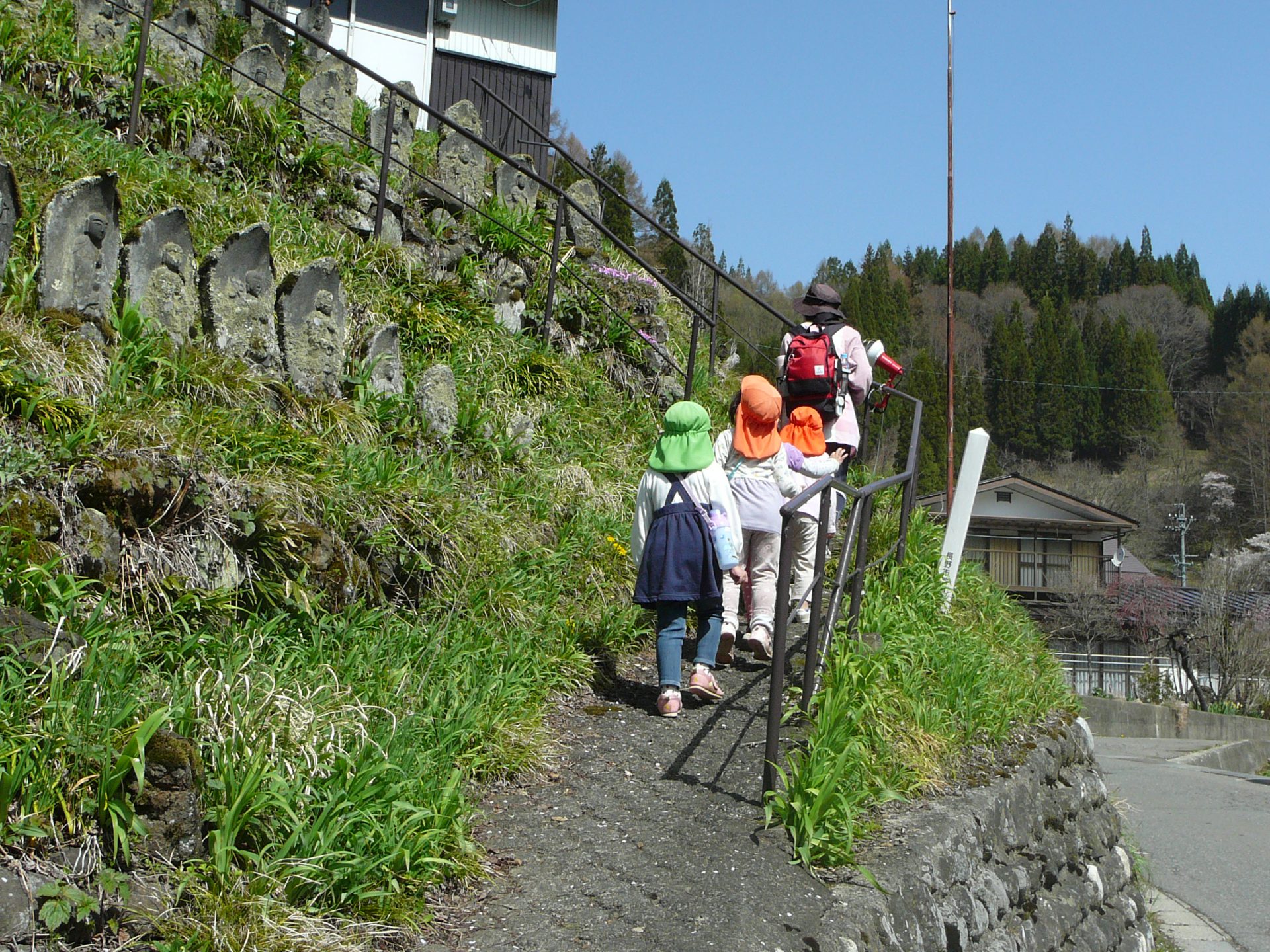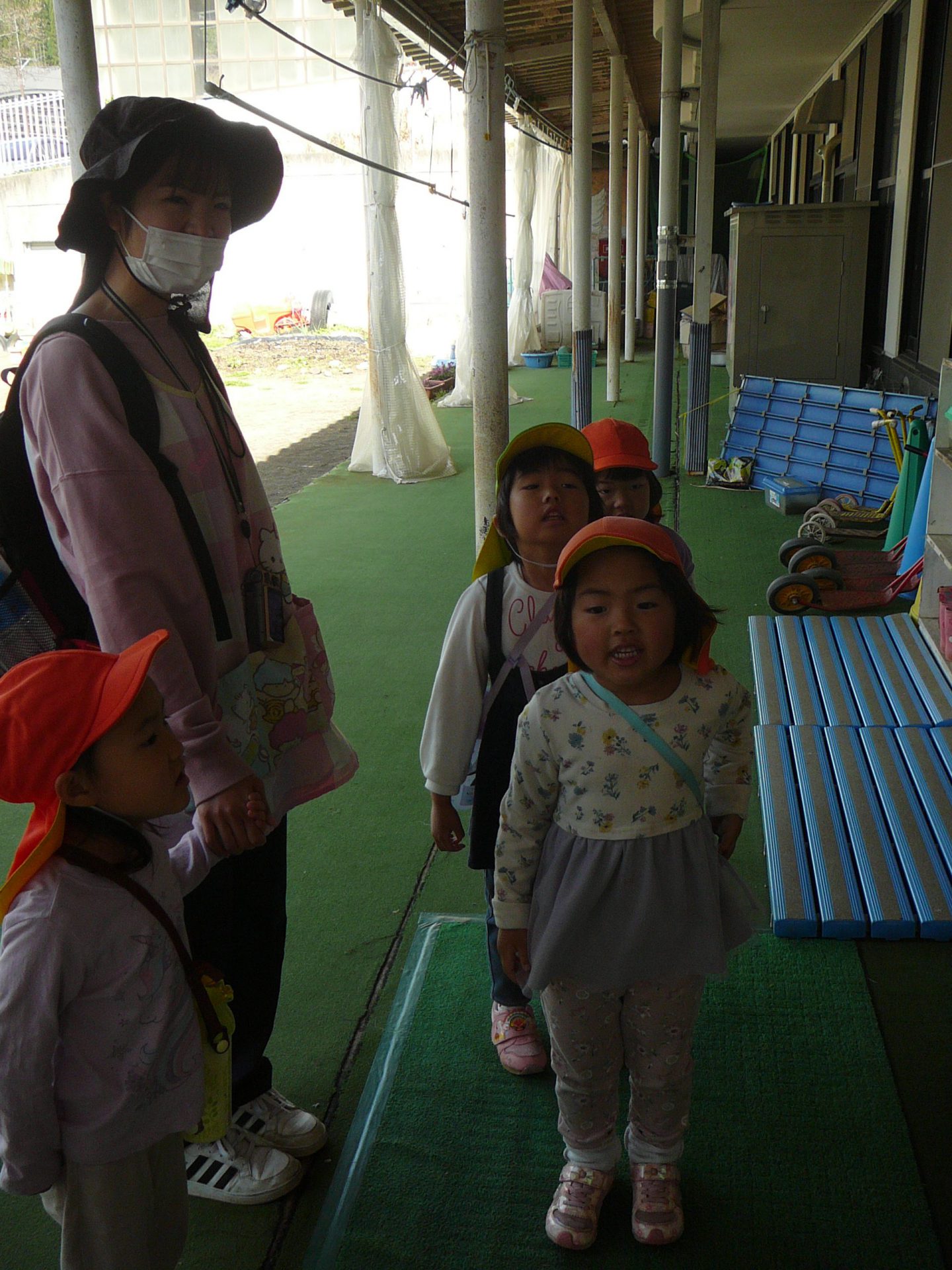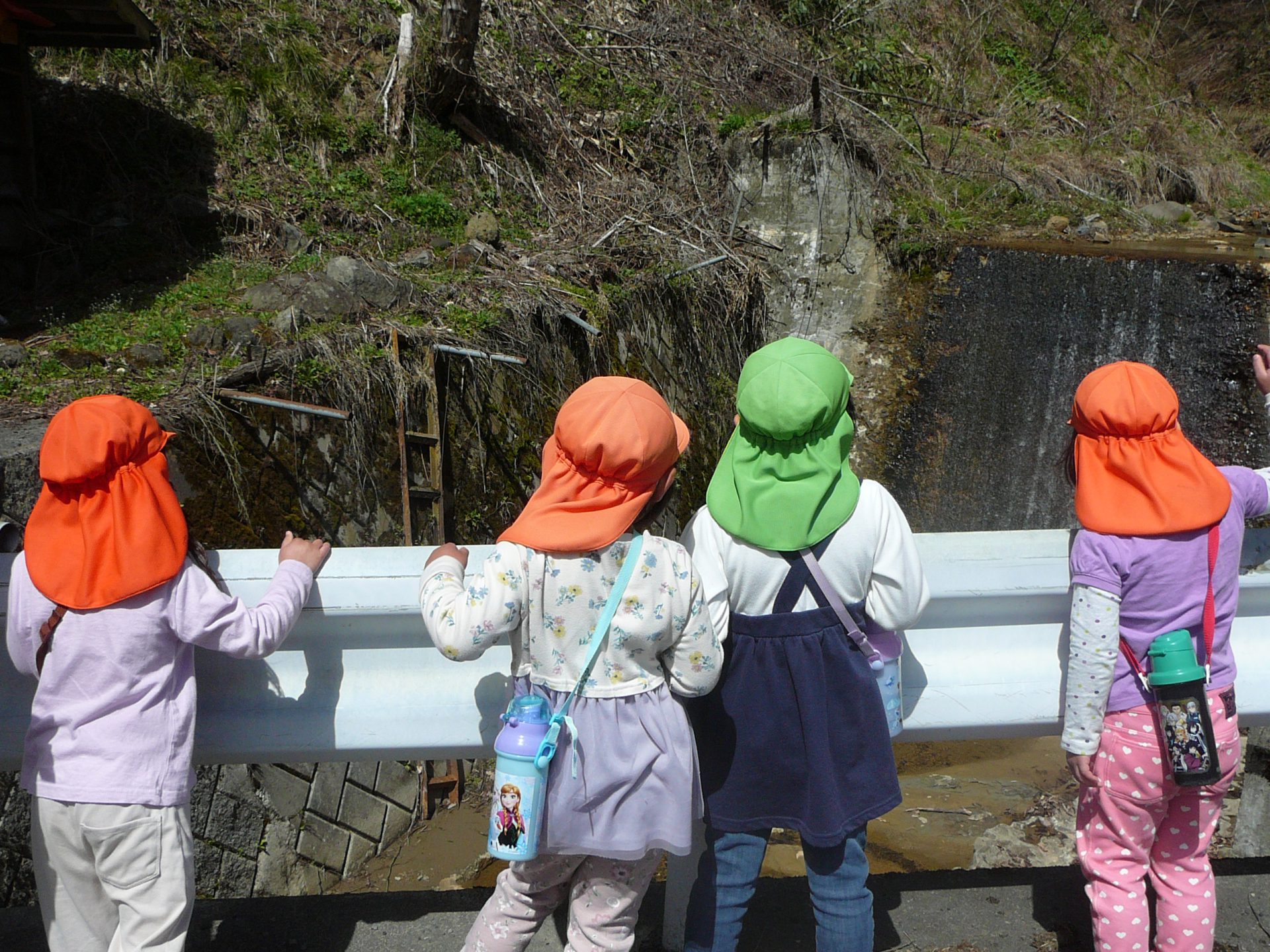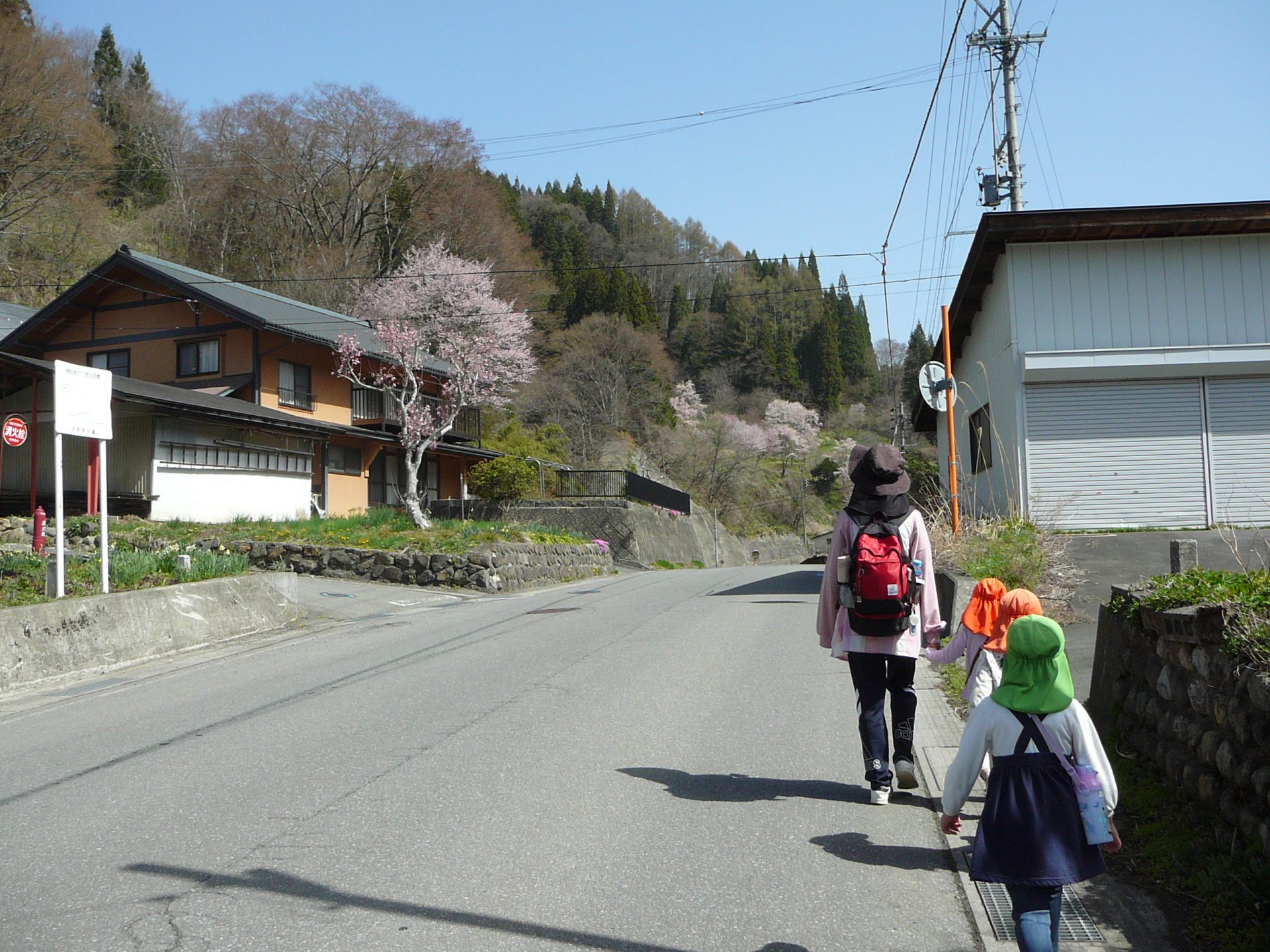 高橋のしだれ桜を見に出かけました。みんなで元気に出発です。「いってきまーす!」
