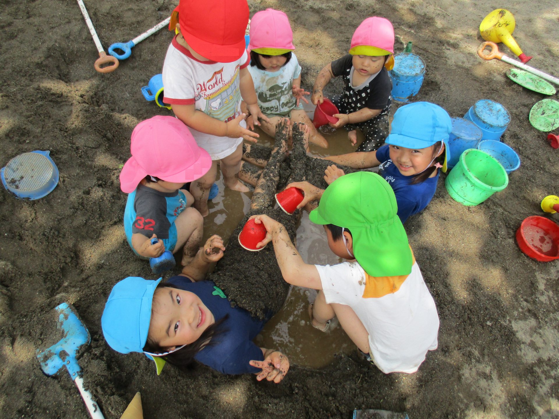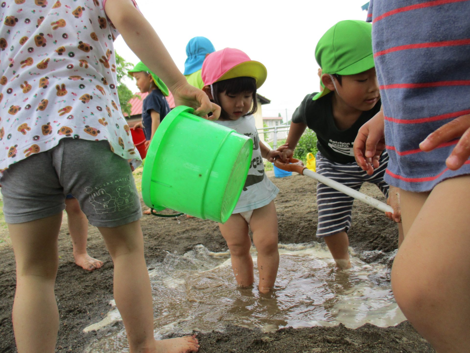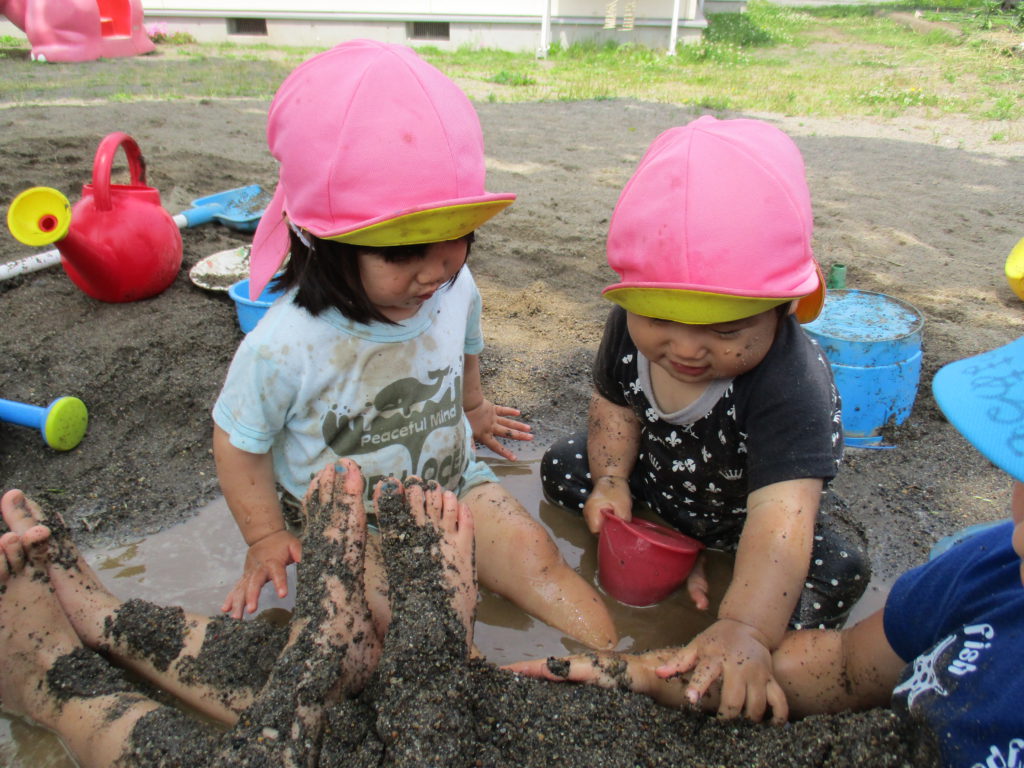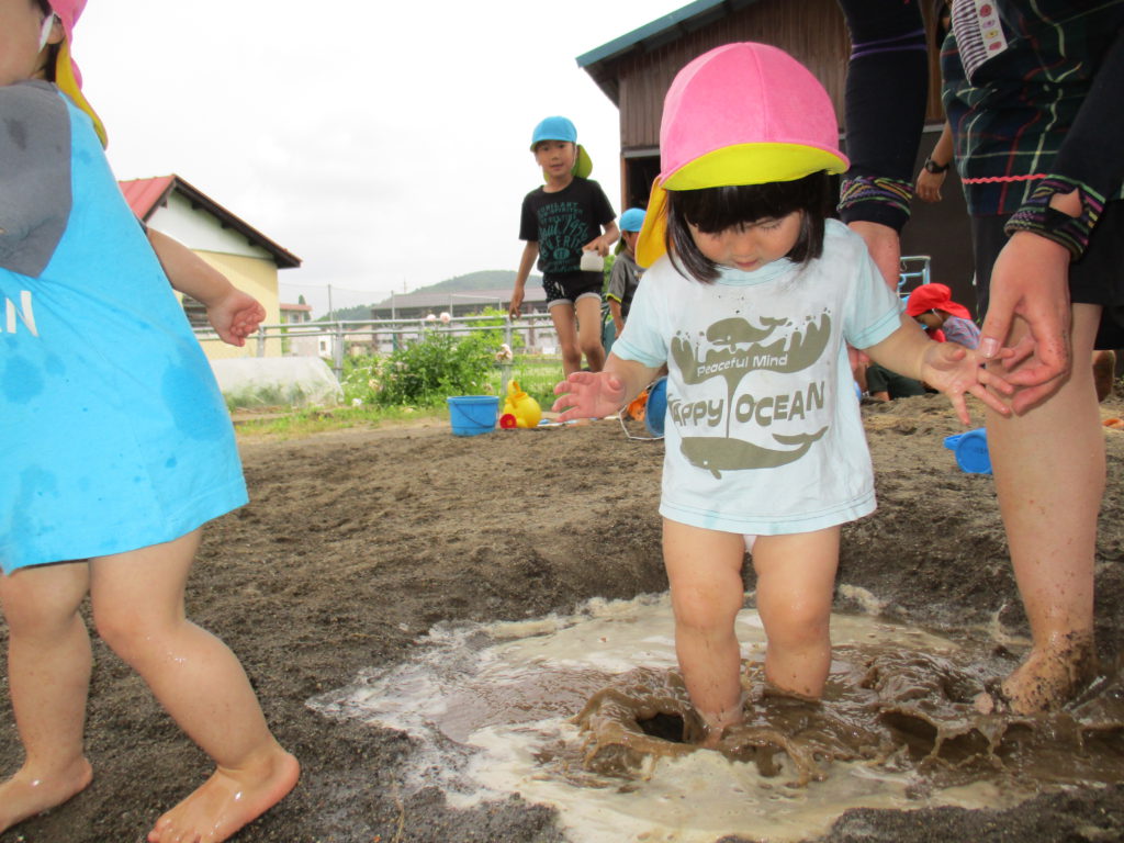 小さいお友達も思い思いに泥んこや水の感触を楽しんでいる泥んこ遊びです。大きいクラスのお友達は泥遊びでも、友達と共通のイメージを持って協力したり、遊びをさらにダイナミックに広げていってほしいです。子どもたちの様子を見守り、仲立ちしていきたいと思います。