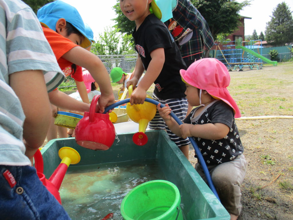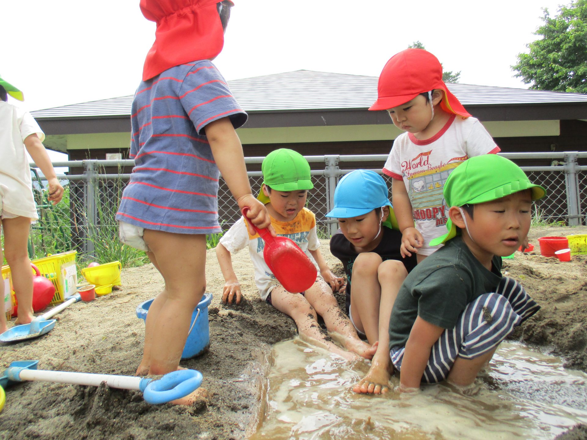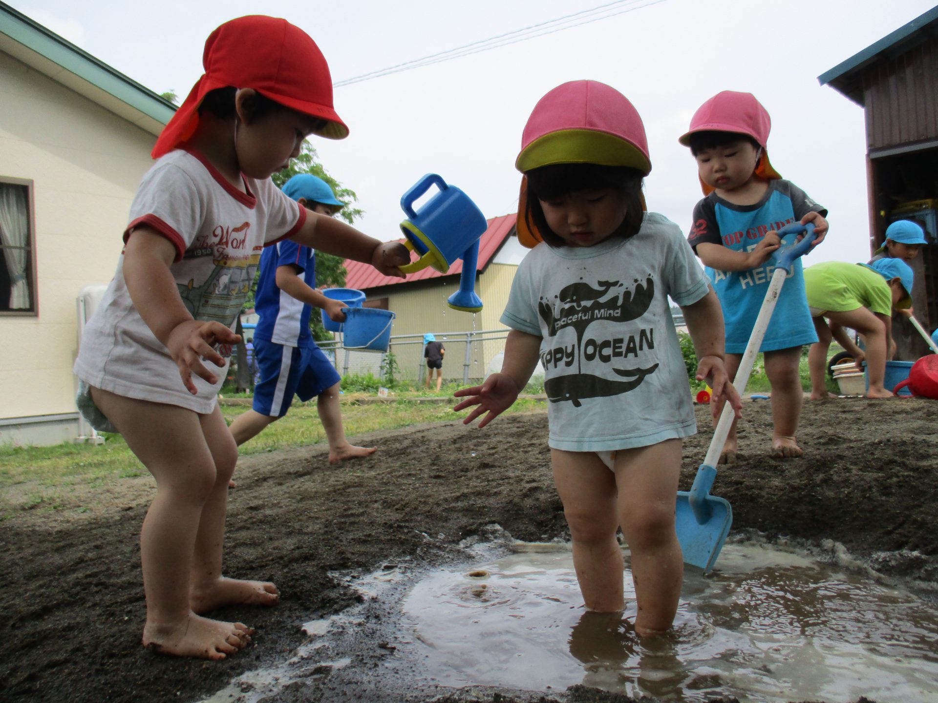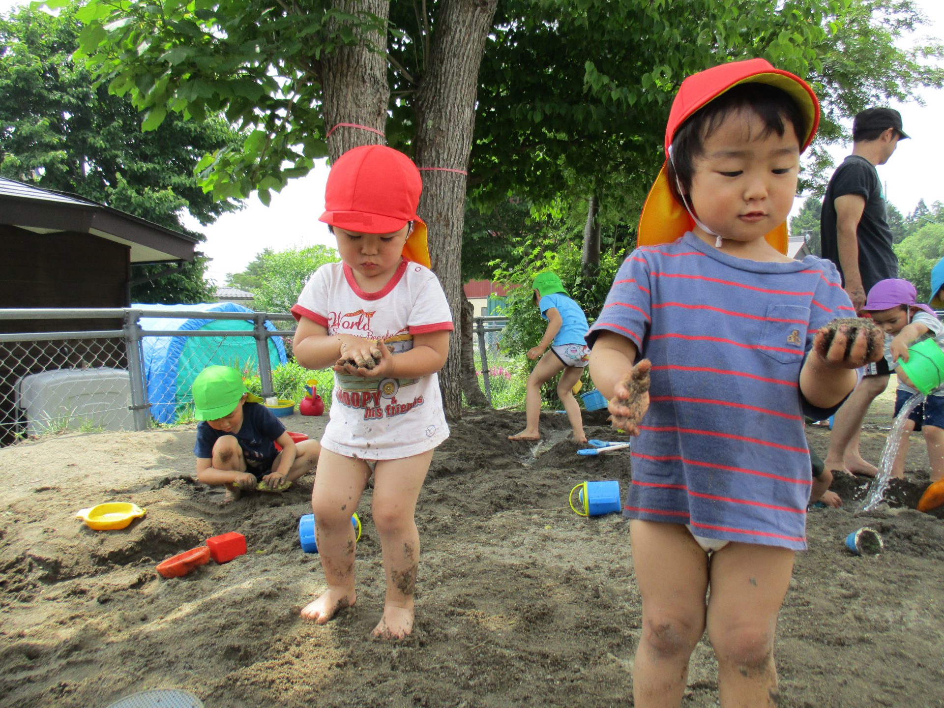 小さいお友達も思い思いに泥んこや水の感触を楽しんでいる泥んこ遊びです。大きいクラスのお友達は泥遊びでも、友達と共通のイメージを持って協力したり、遊びをさらにダイナミックに広げていってほしいです。子どもたちの様子を見守り、仲立ちしていきたいと思います。