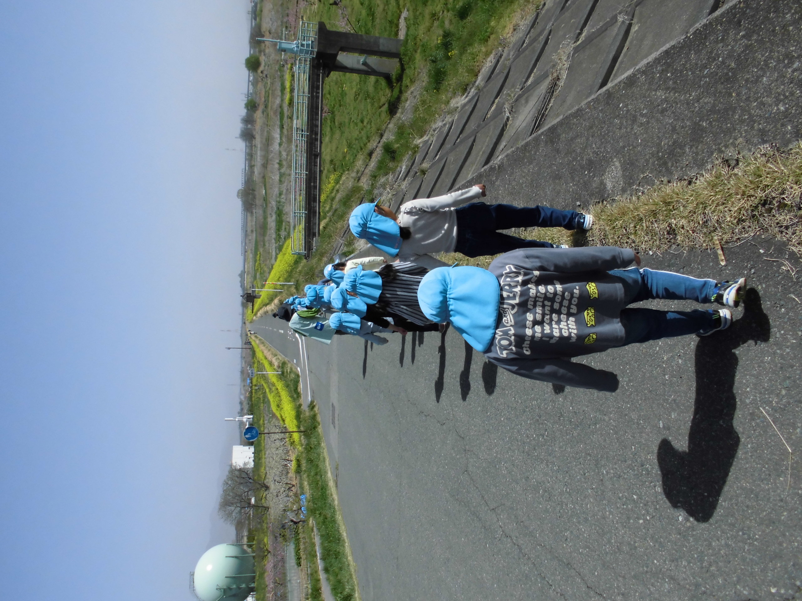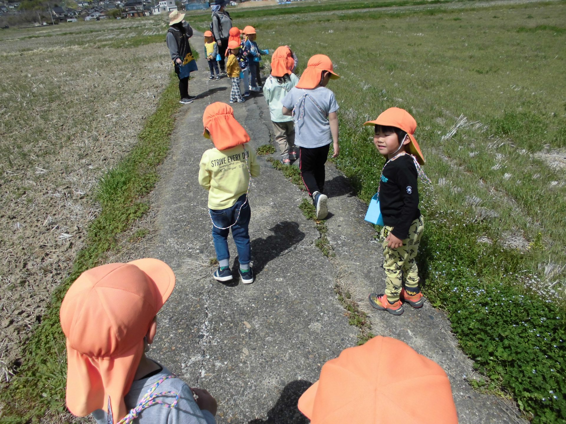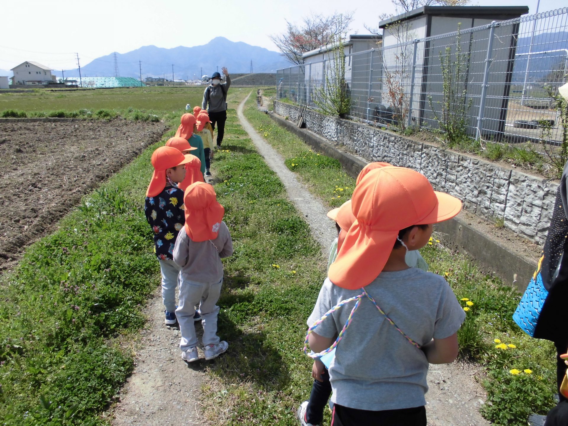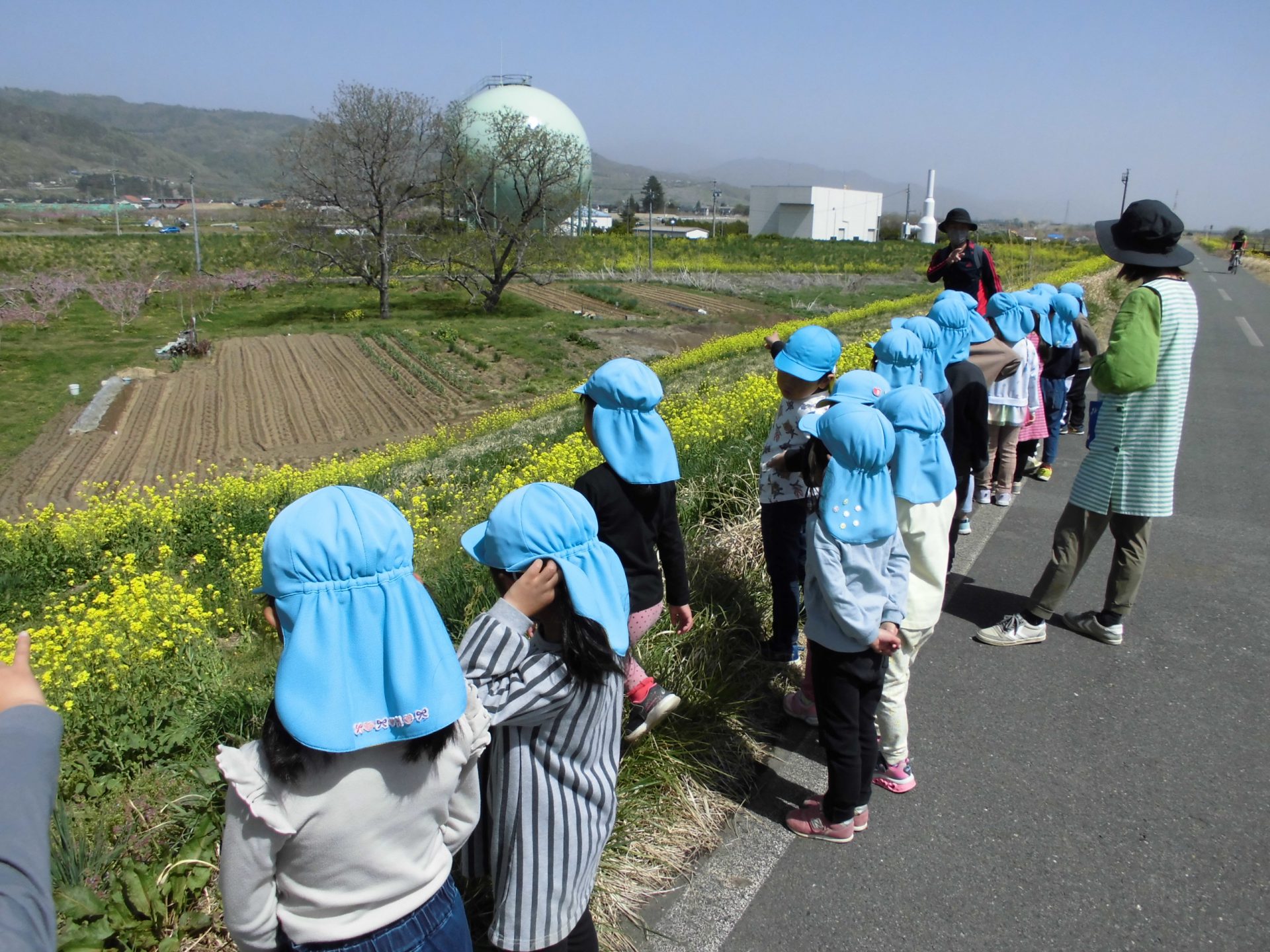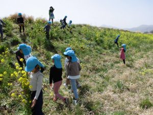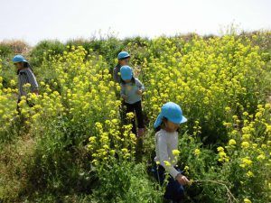 菜の花が咲く土手を見て「花だらけ~」と喜ぶ子どもたち。