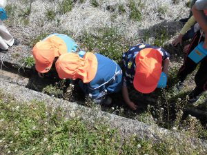 側溝ではタニシを見つけて、取りたい子どもたちは手を一生懸命伸ばしますが届かず、工夫して試行錯誤していました。