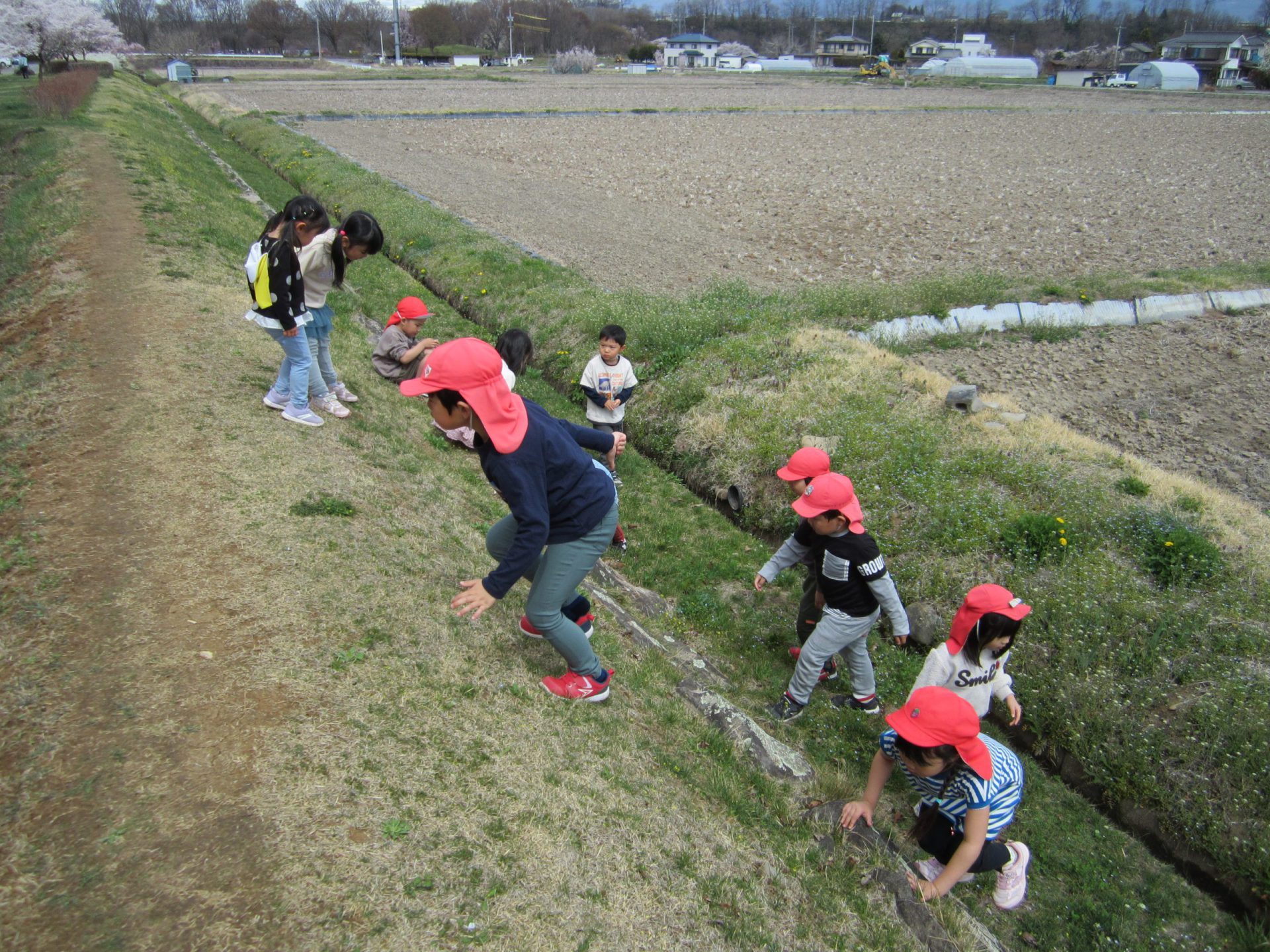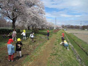 進級・入園して初めてのお散歩でした。年中さんと手をつないだ年長さんは車道側を歩くなど”大きくなった”という自覚が持てたようです。これからも異年齢で交流しながら、地域の自然にたくさん触れて遊んでいきたいと思います。