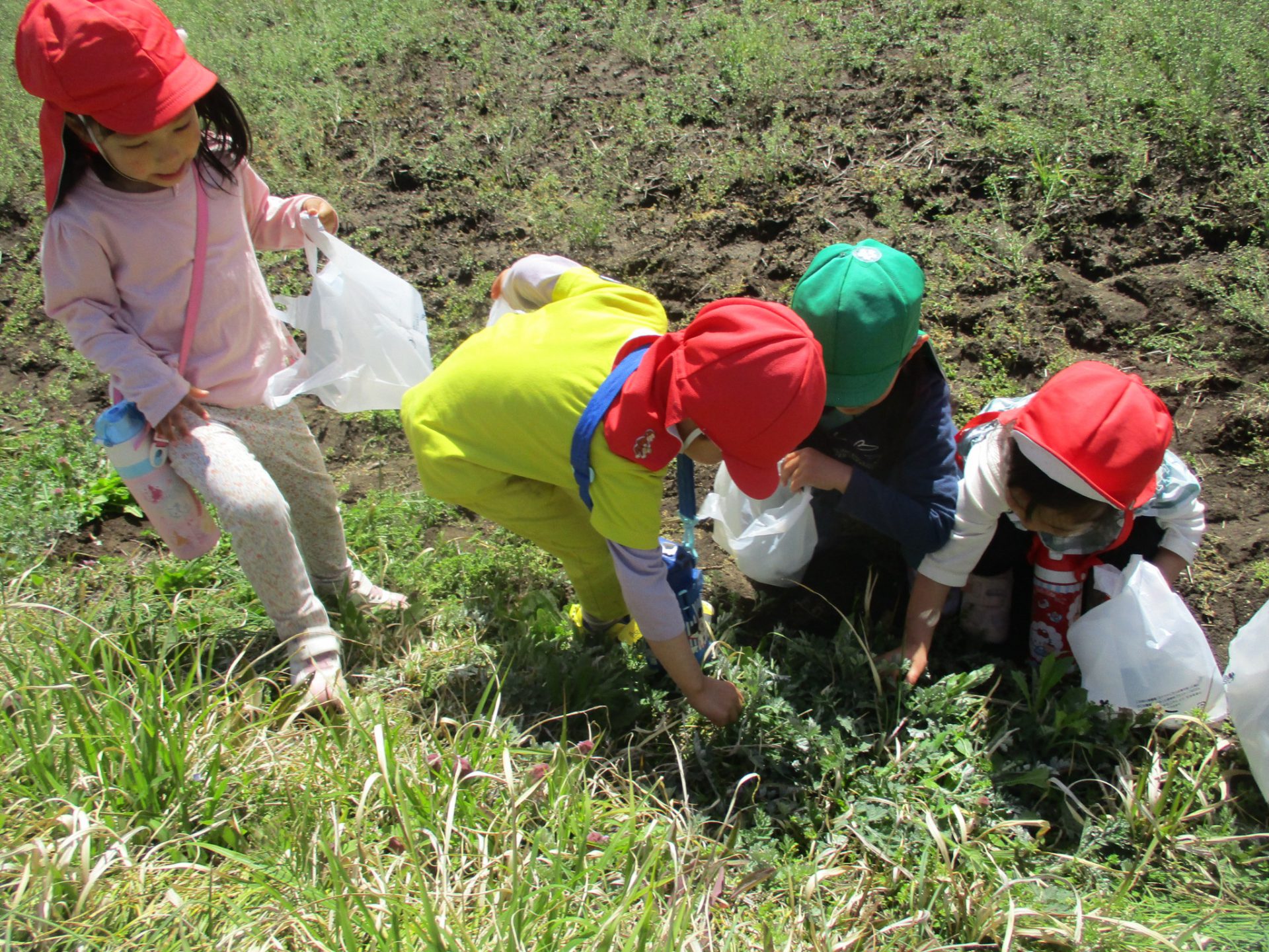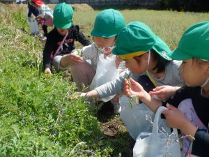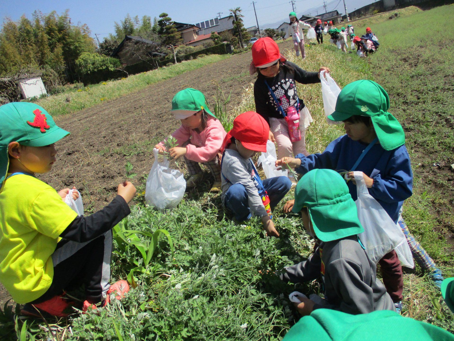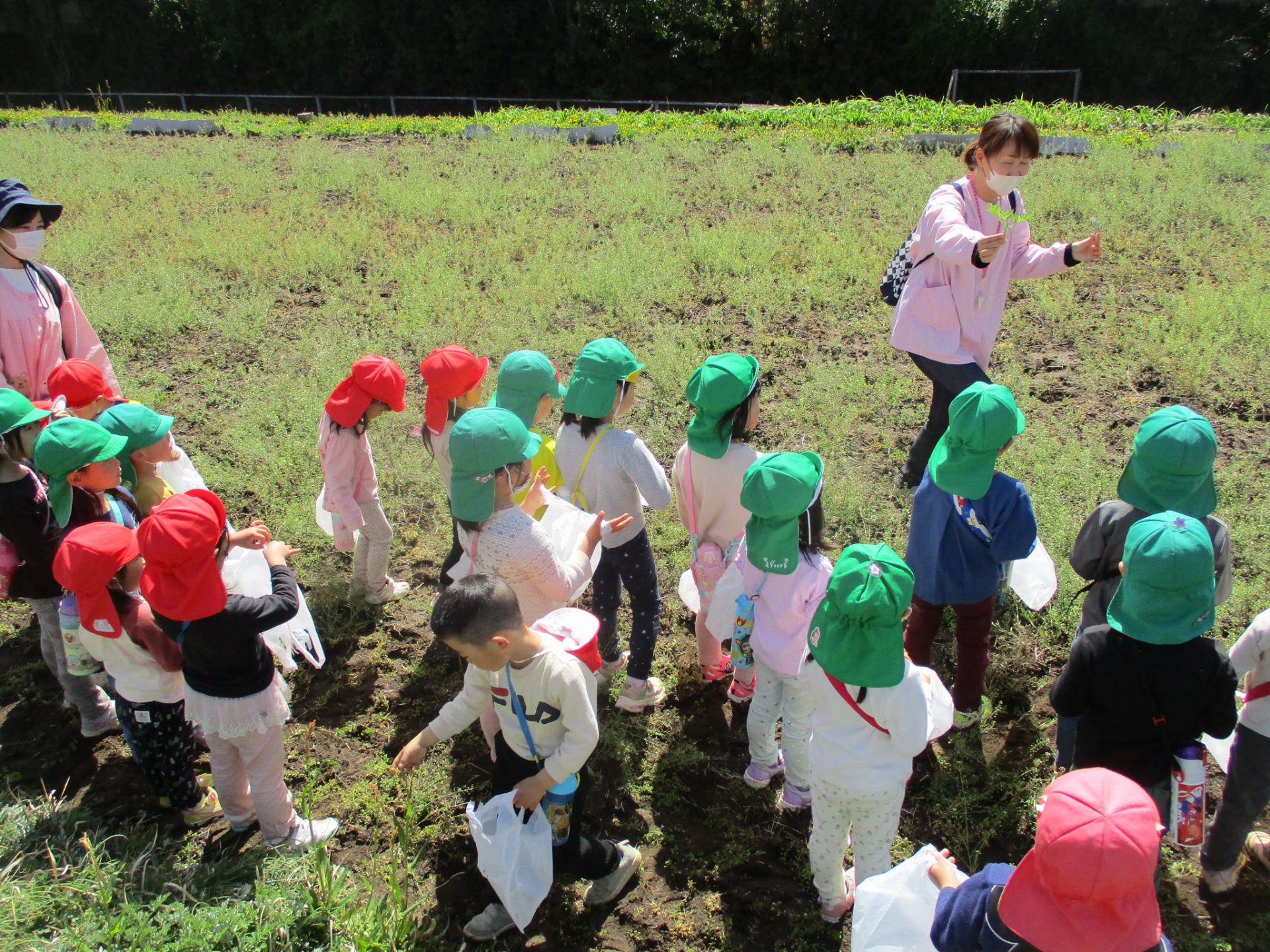 きれいなよもぎを選んで探して採っていく年長さんと、質より量!!の年中さん(笑)