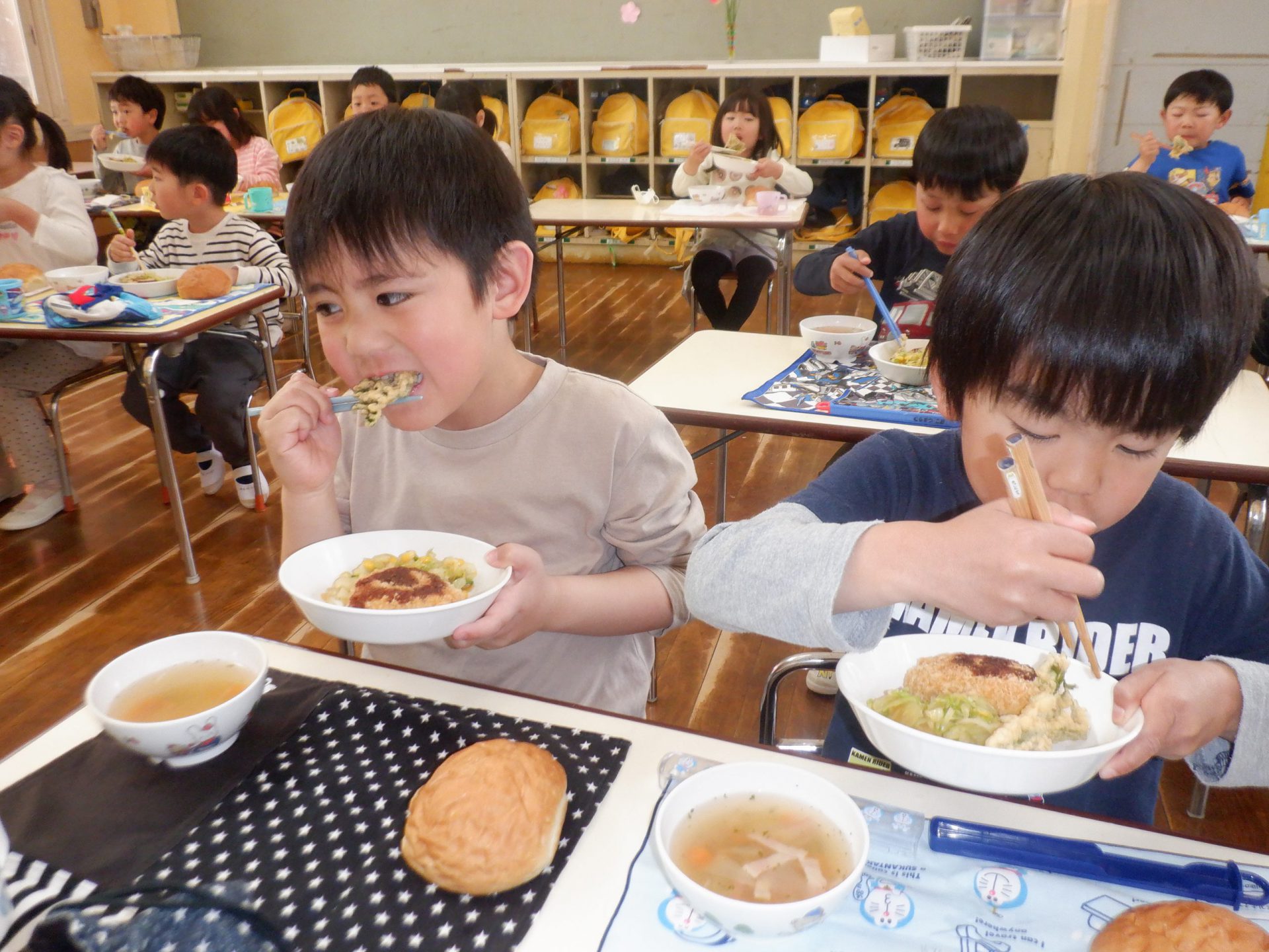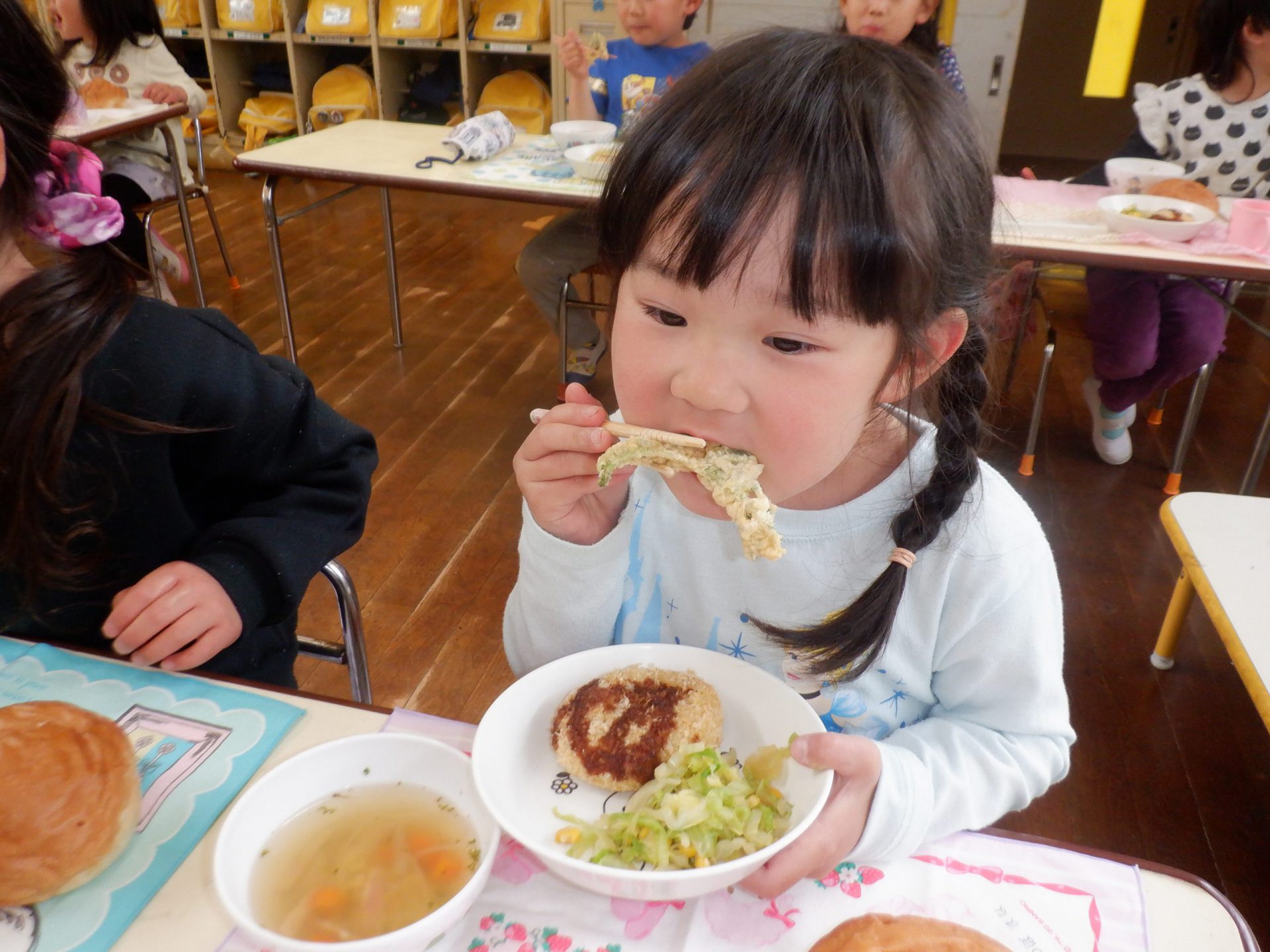 年長さんはよもぎを天ぷらにしてもらい、食べてみました♬