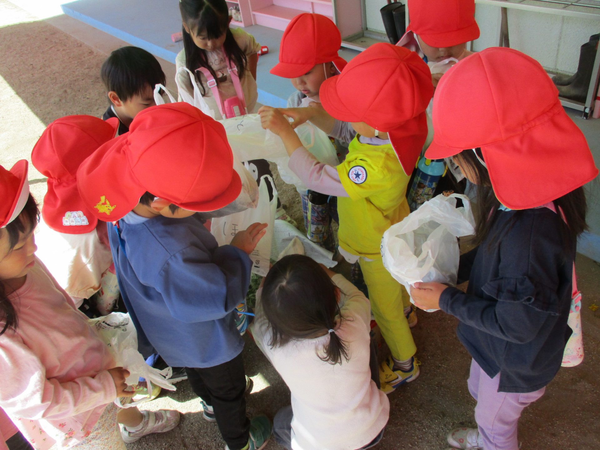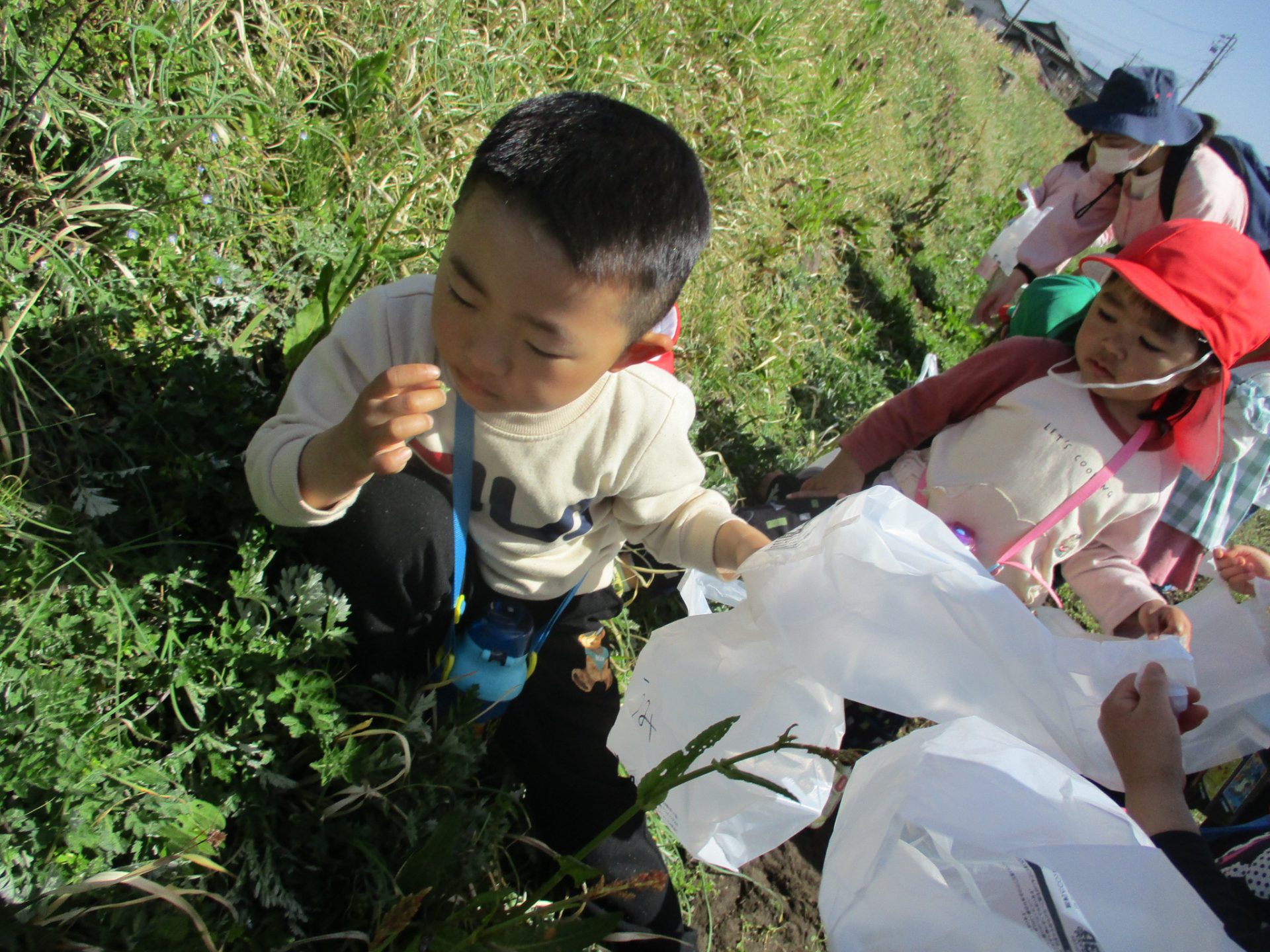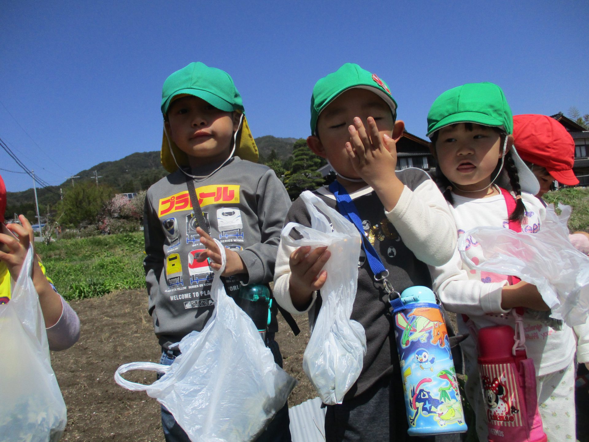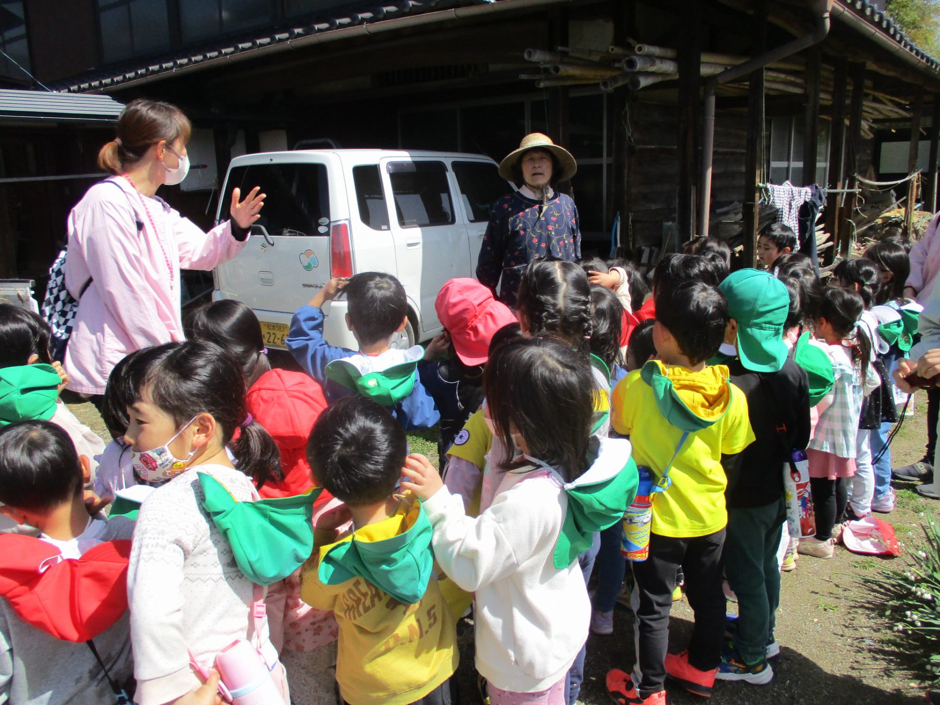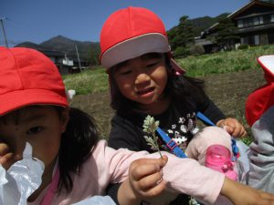 ・「どこでも入って採っていいに!」と温かい言葉をかけてくださったり、にこにこしながら見ていて下さったりと、地域の方を身近に感じることができました。今後、散歩の途中でおじさんやおばさんの顔を見た時には子どもたちから自然と声がかけられるのではと思います。