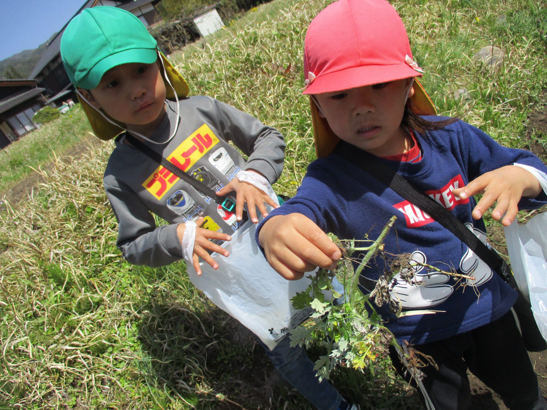 ・よもぎ採りは一年に一度の経験ではあるけれど、昨年、年上の友だちから教えてもらったよもぎの形を覚えていている子どもたちが多くいることに驚きました。そして、よもぎが分からない友だちに、よもぎを指さし「これだよ!」と教えるだけでなく、特徴を自分の言葉で表現し伝えようとしていました。この時期ならではの経験を毎年大切につないでいきたいと感じました。