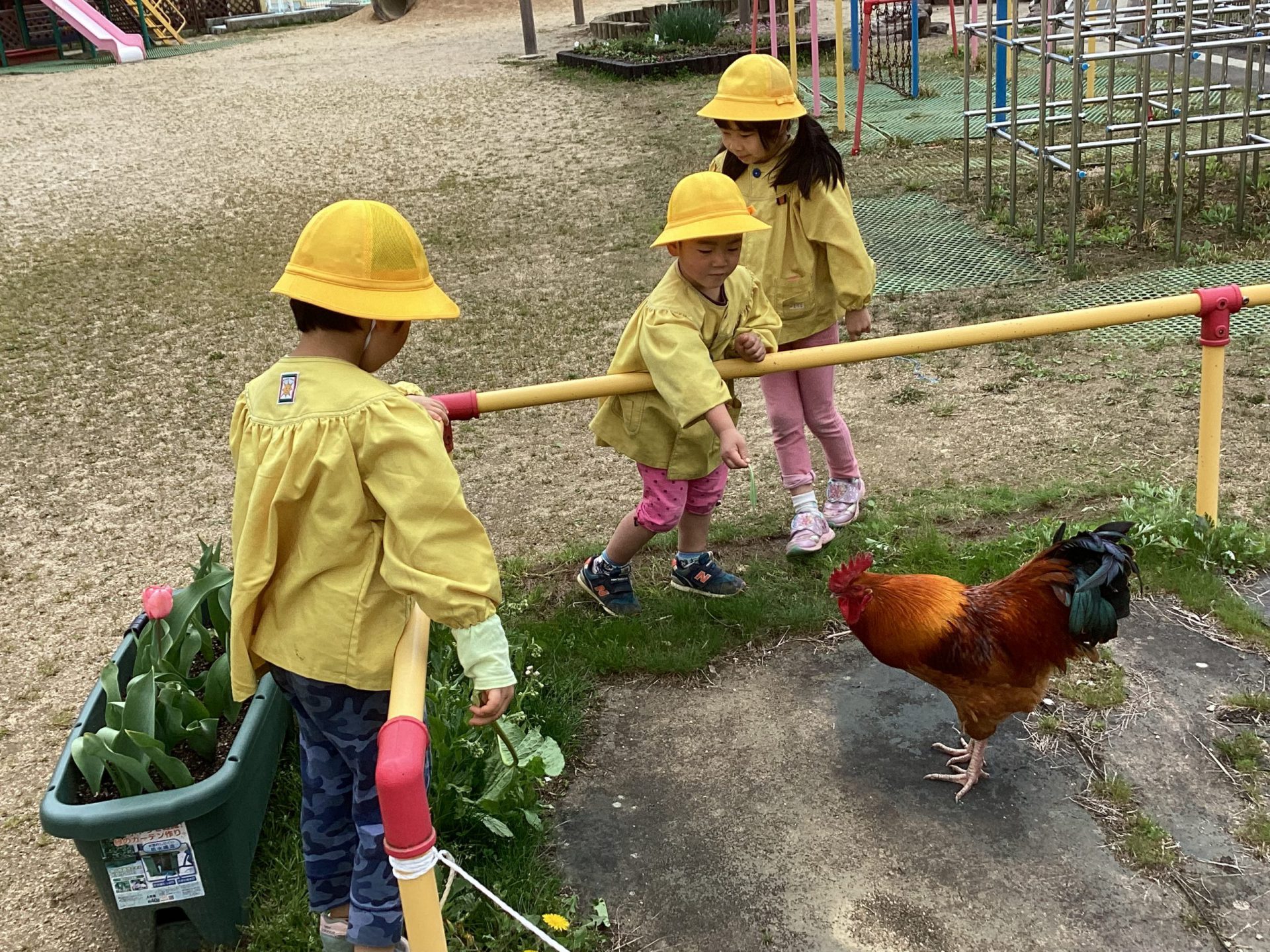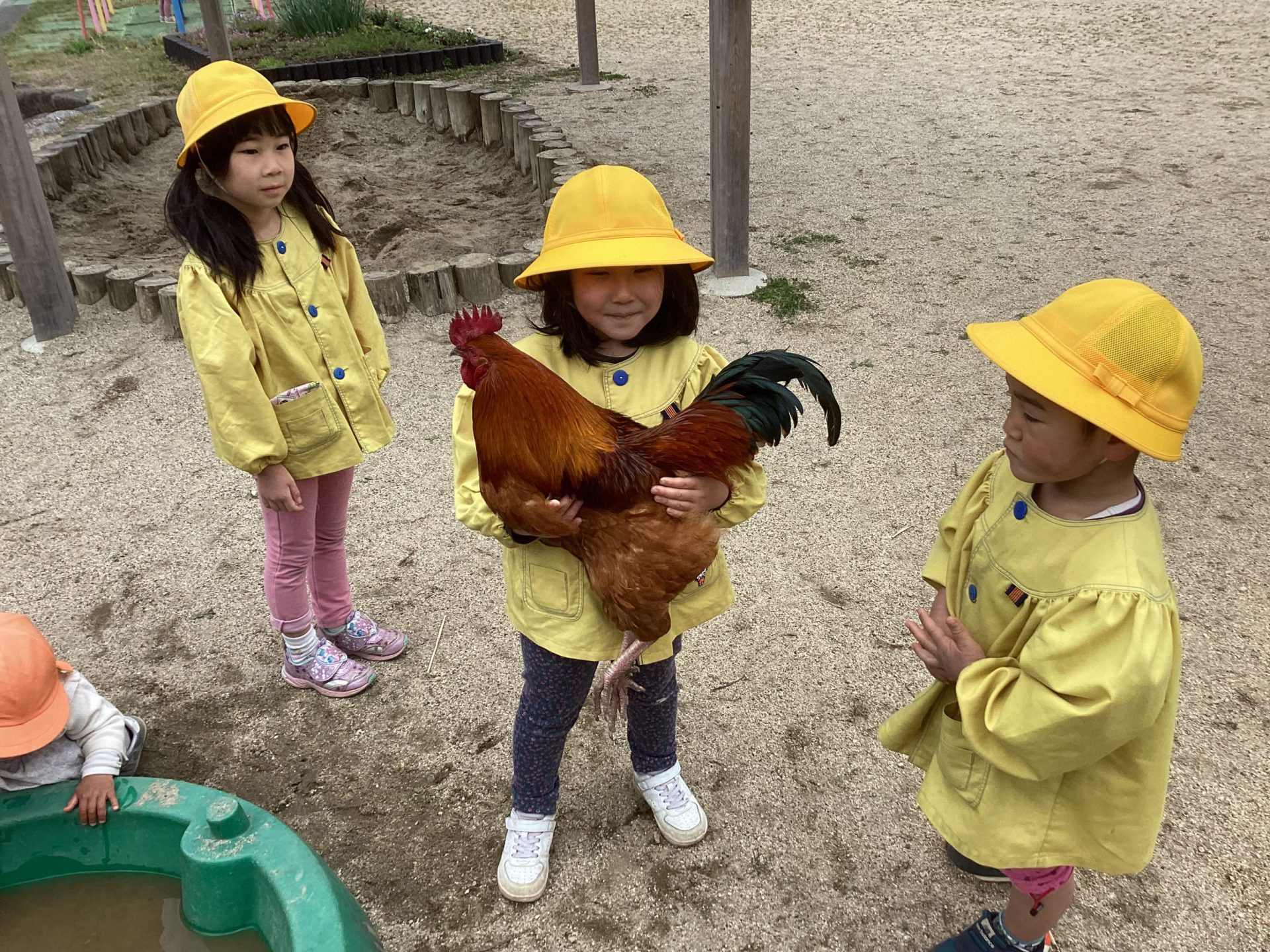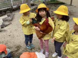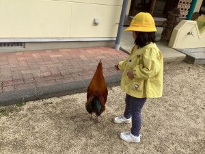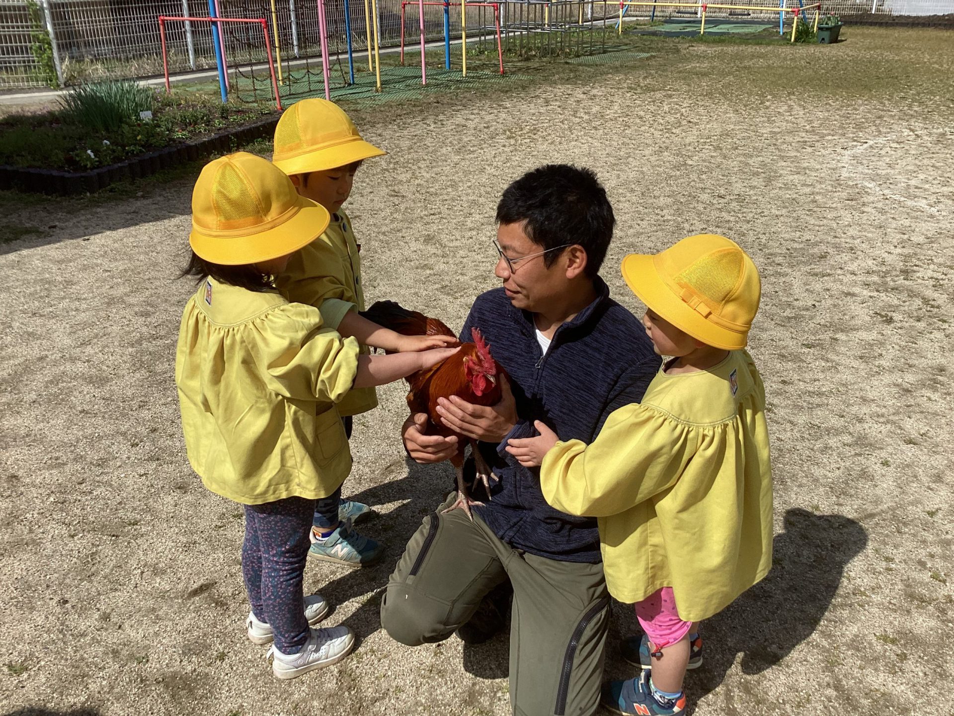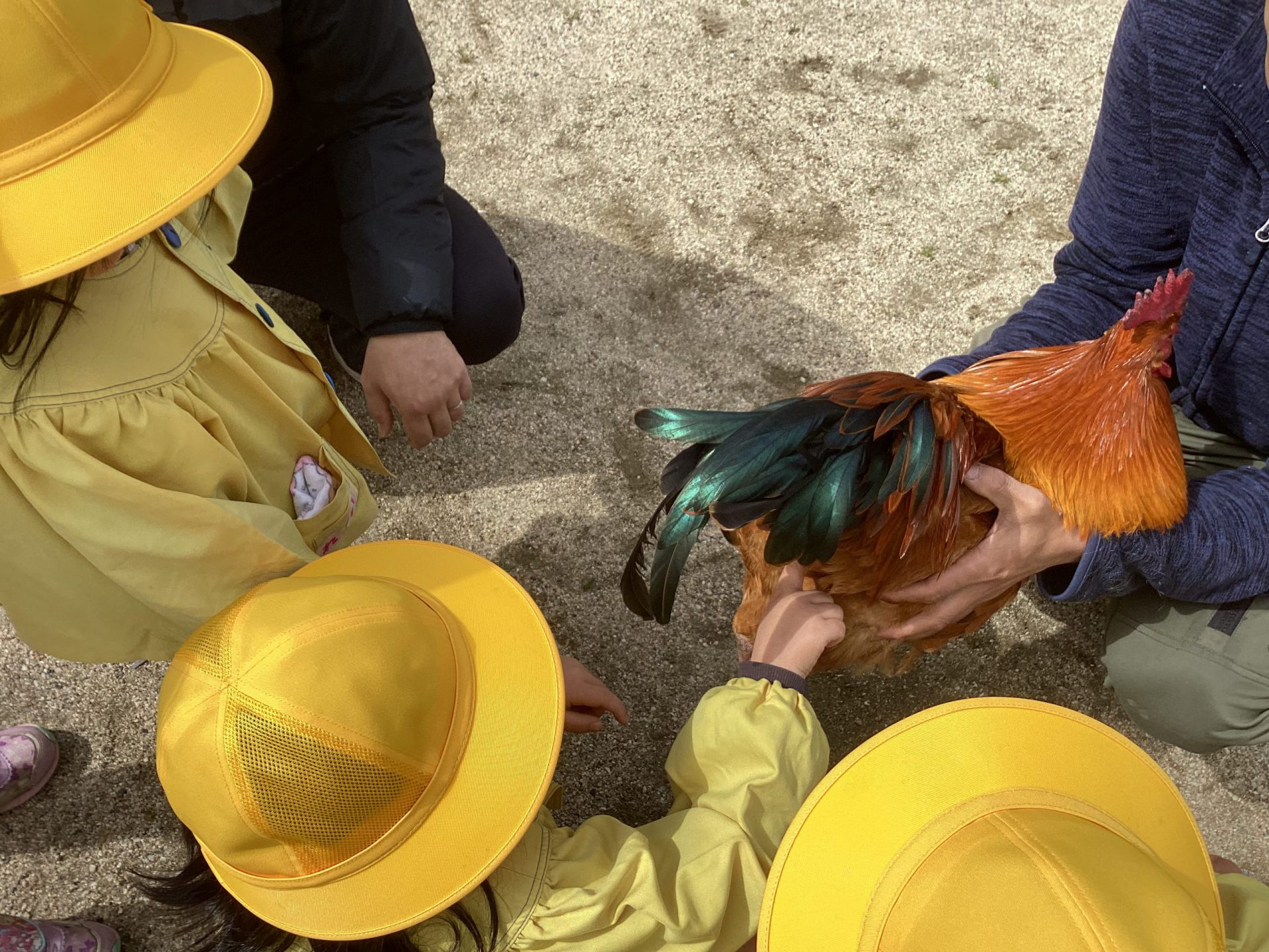 今回は、ネバーランドの山遊びでお世話になった幸山さんが雄鶏とひよこ3羽を連れて保育所に遊びに来てくれました。