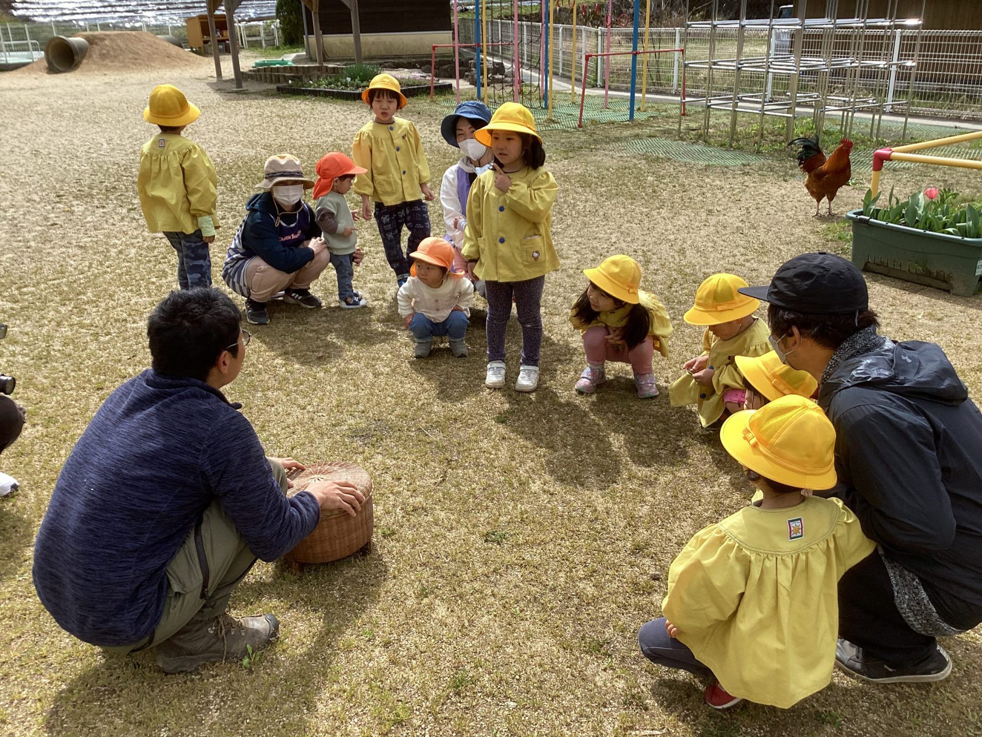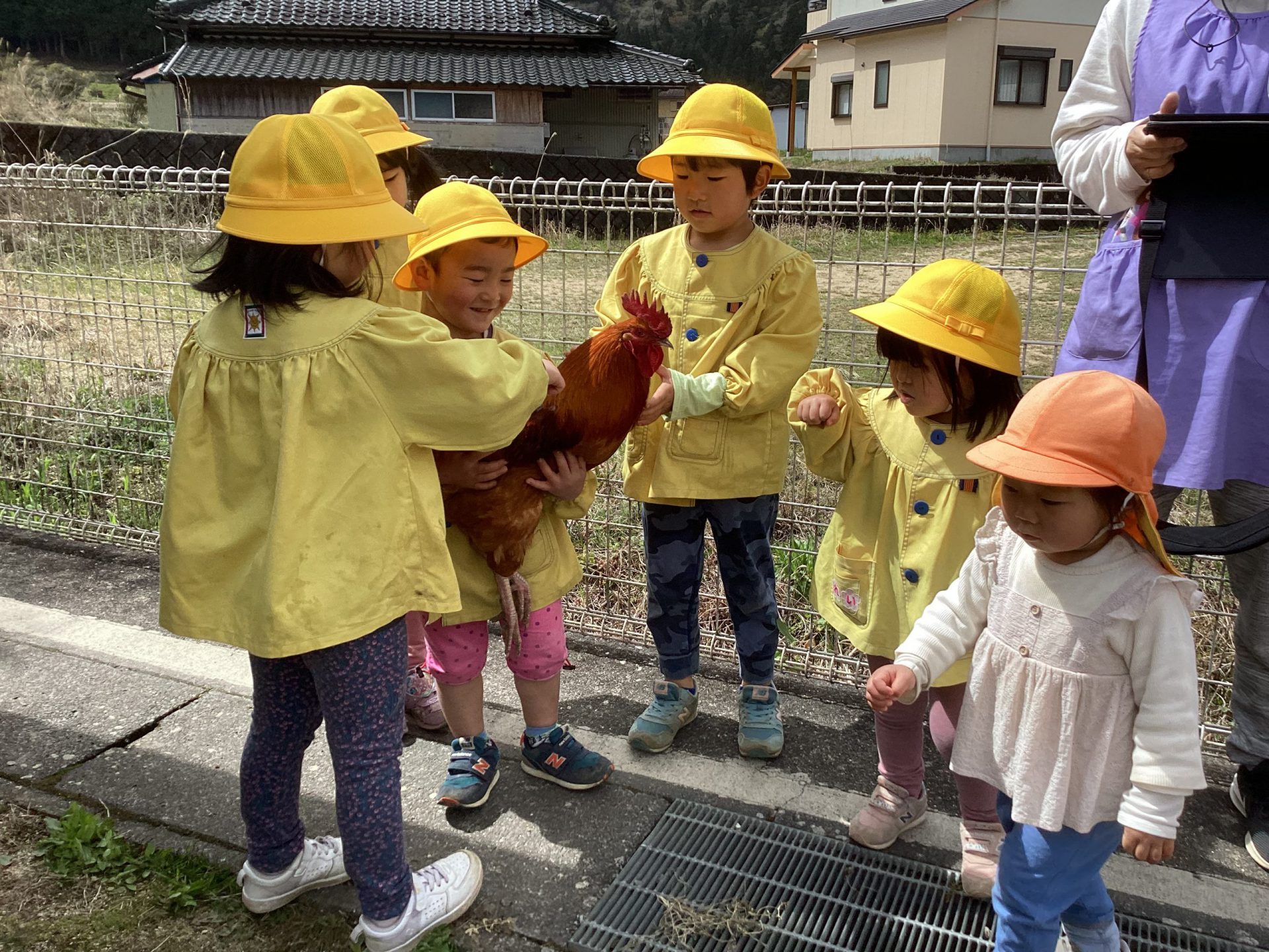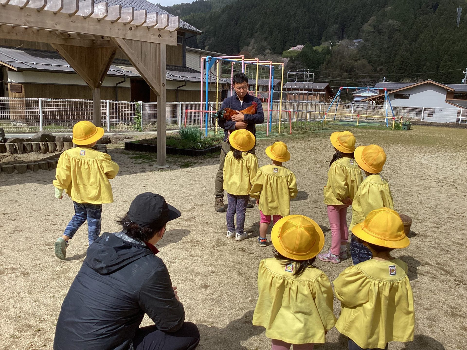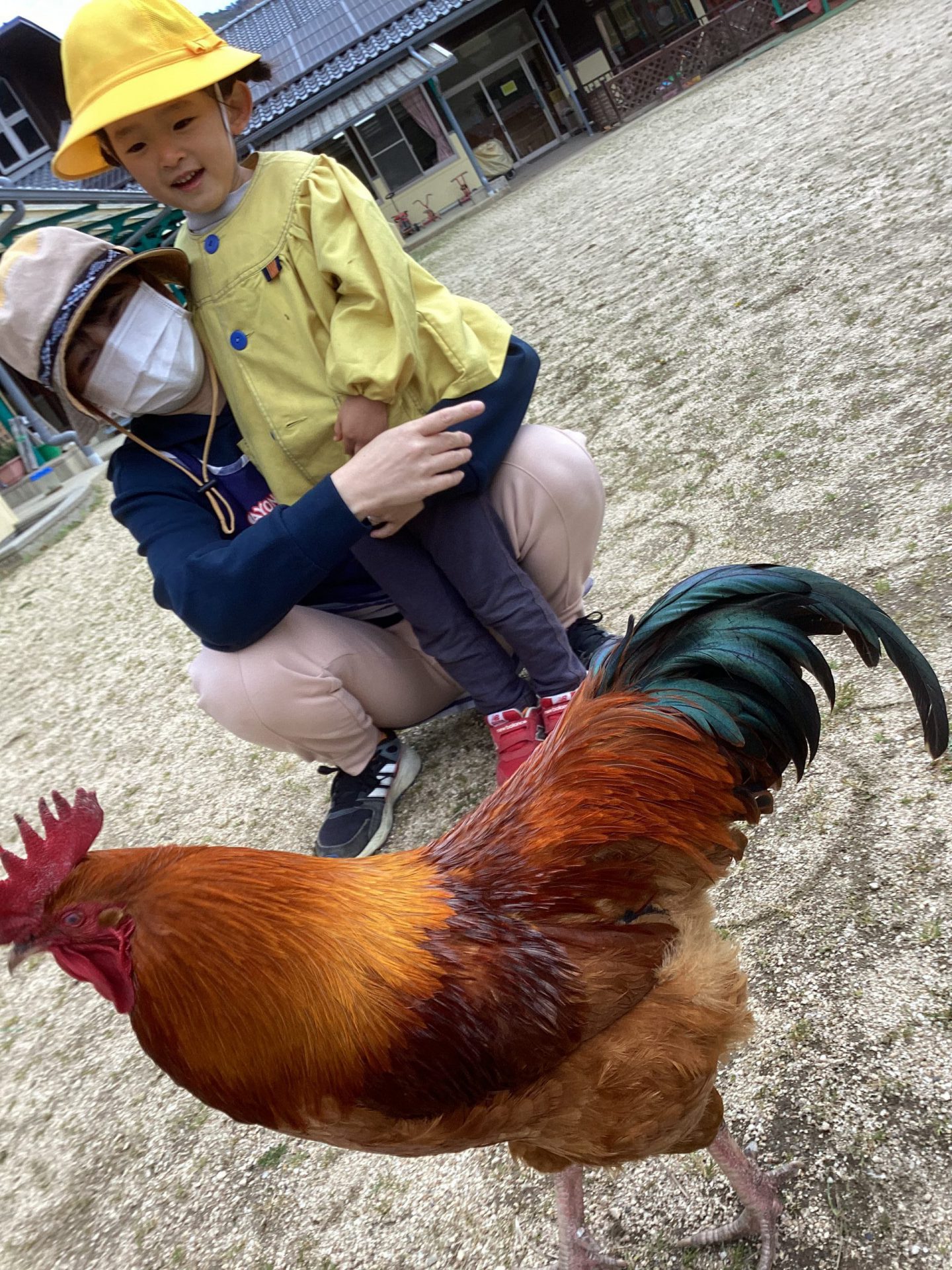 今回は、ネバーランドの山遊びでお世話になった幸山さんが雄鶏とひよこ3羽を連れて保育所に遊びに来てくれました。