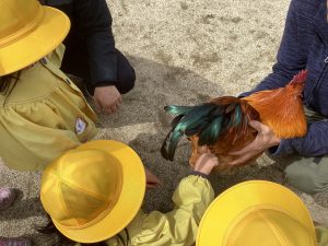 雄鶏たちと仲良くなるには、雄鶏たちの事を知ることが大事という事で、(雄鶏は生後3か月、ひよこたちは生後1カ月弱です。)にわとりの体のついて話を聞きました。にわとりの目、鼻、口、耳はどこでしょうクイズです。子どもたちは思い思いの場所を言っていきます。耳が一番難しかったようです。