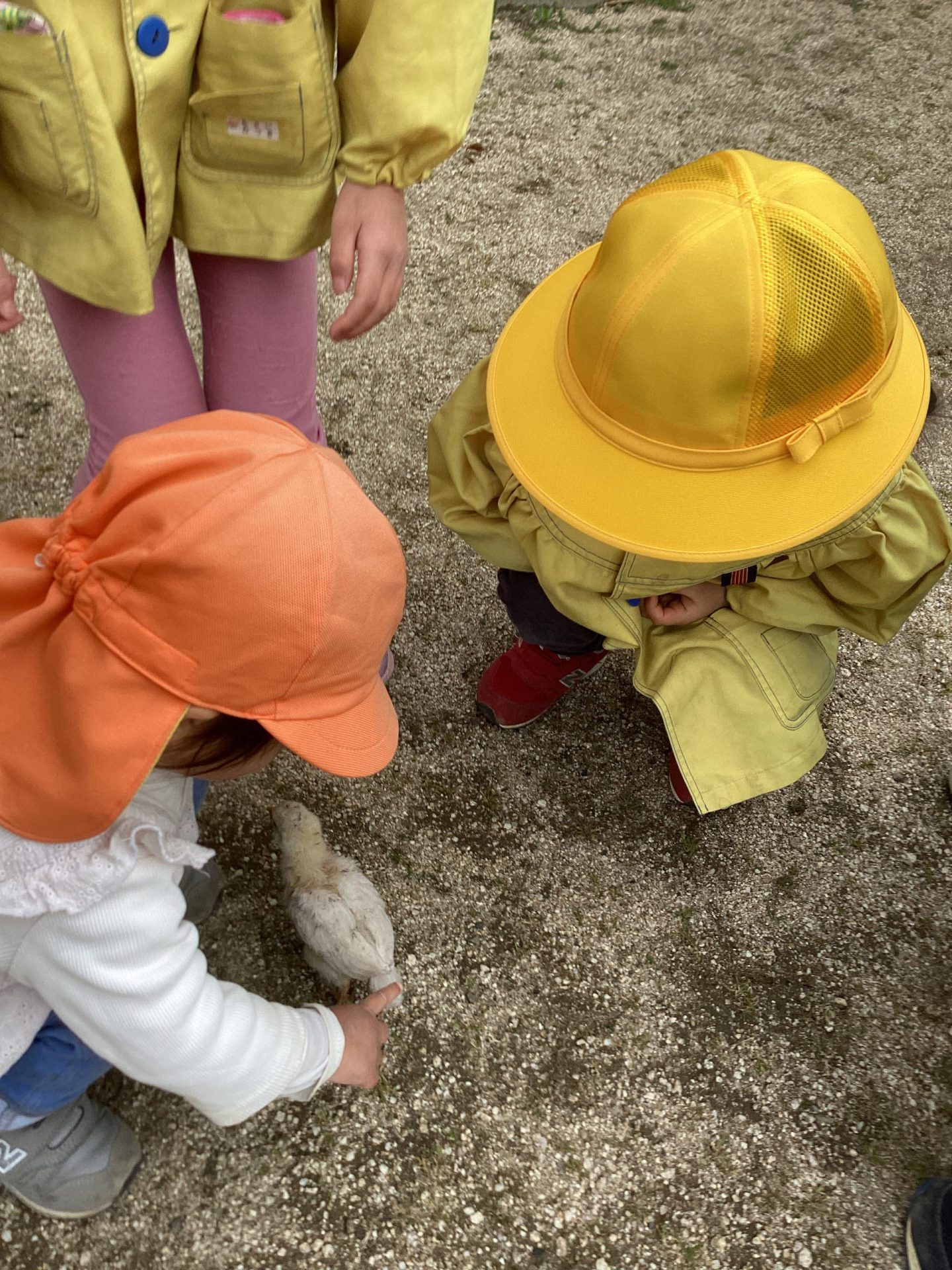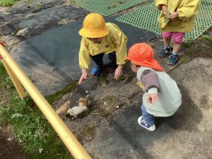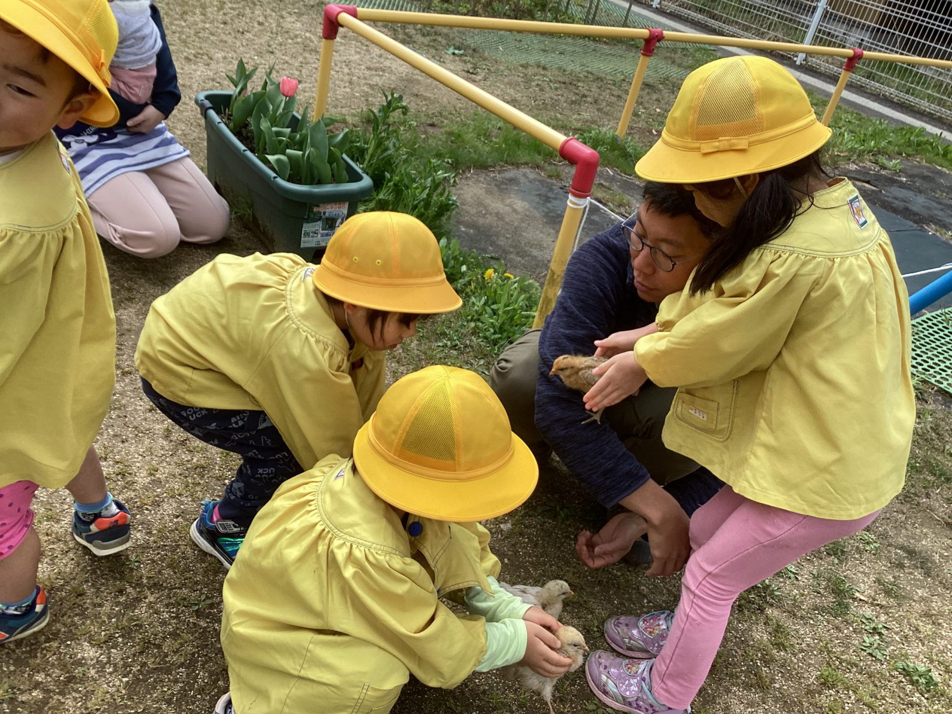 ・ひよこが鳴く声を聴いて、子:「声の大きさが違うね」 保:「寂しいから、大きな声で鳴いて探しているんだよ」 子:「みんなと一緒だと、鳴き方も小さくなるね」 子:「安心するのかな?」