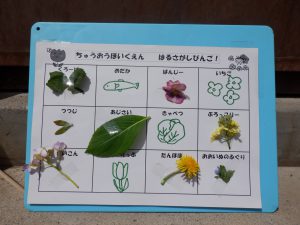 ・葉っぱや花の写真のヒントを見ると、園内のどこにあるのかすぐに気づいた子ども達。