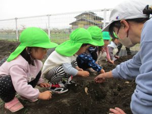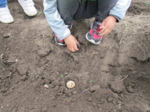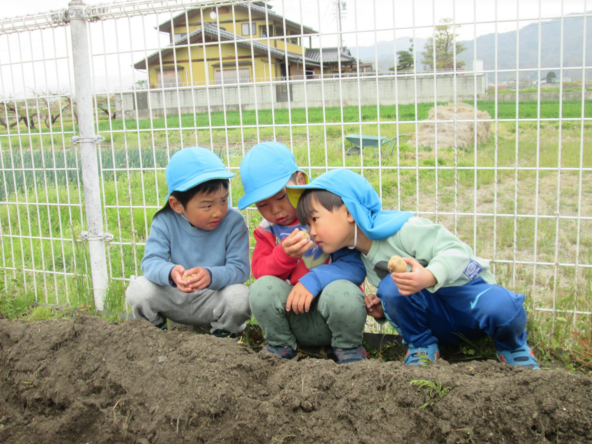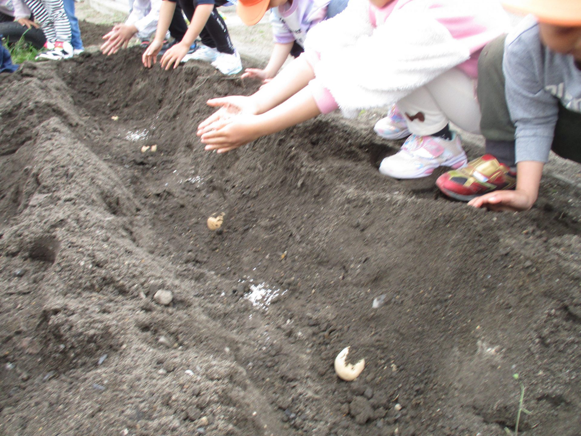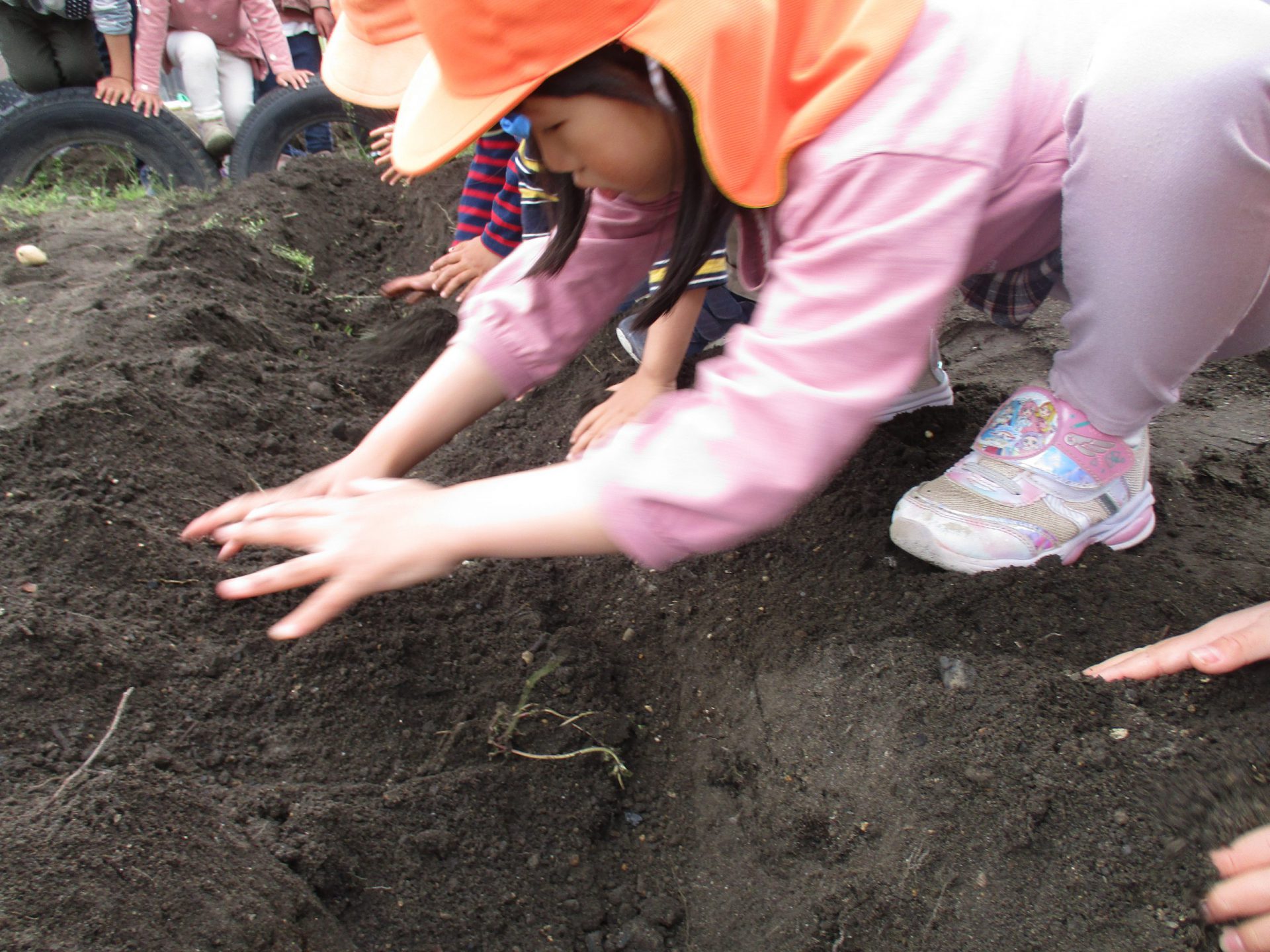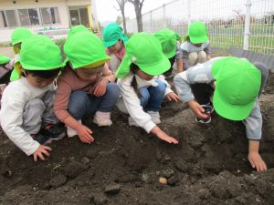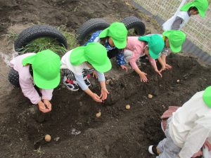 子ども達が、「これは(種芋)は食べられるの?」「何がニョキニョキ出ているの?」と不思議に感じる姿に共感しながら一緒に植えることを楽しみました。