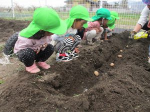 土の感触を楽しみながら、じゃがいもの種芋を植えました。