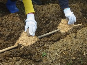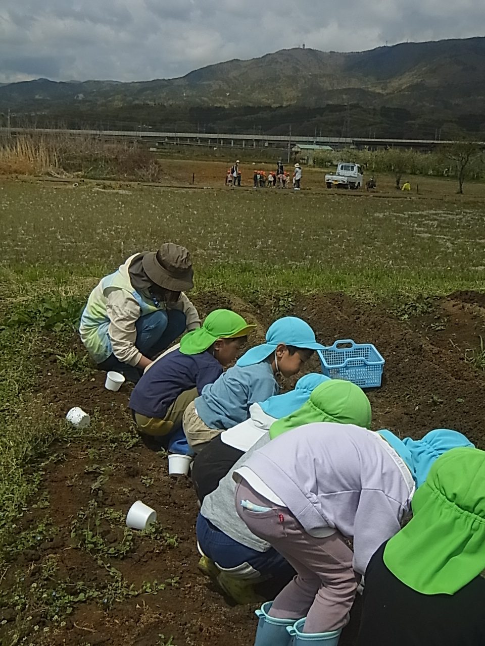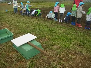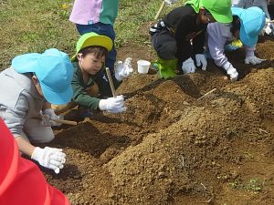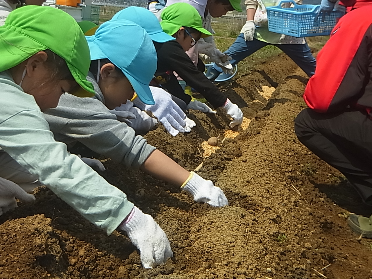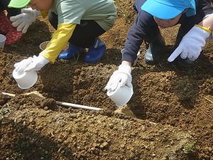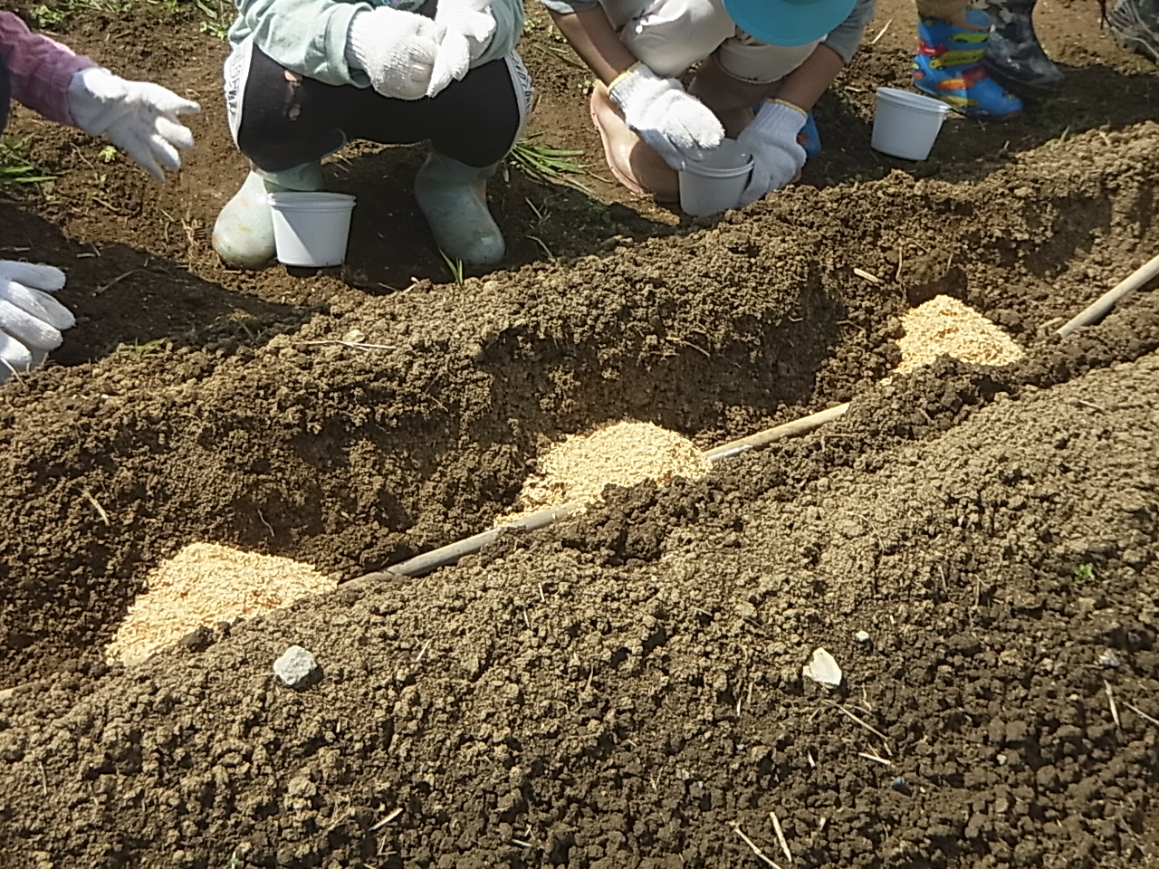 2つめはおいもの「おふとん」その上にたねいもを寝かせてあげます。