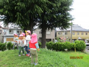 ・頂上から見える大きな木を見て「何の木だろう?」「さわさわ~って音がするよ!」と疑問や発見を伝える子がいました。